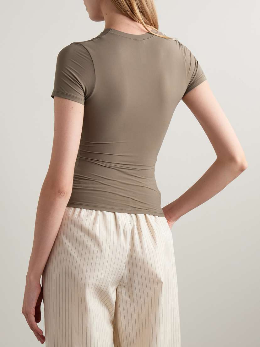 Одна из целей SKIMS - предлагать решения для любого типа фигуры. Эта облегающая футболка сшита из эластичной ткани и имеет классический круглый вырез. Сочетайте ее с чем угодно: от спортивных брюк до классической одежды.