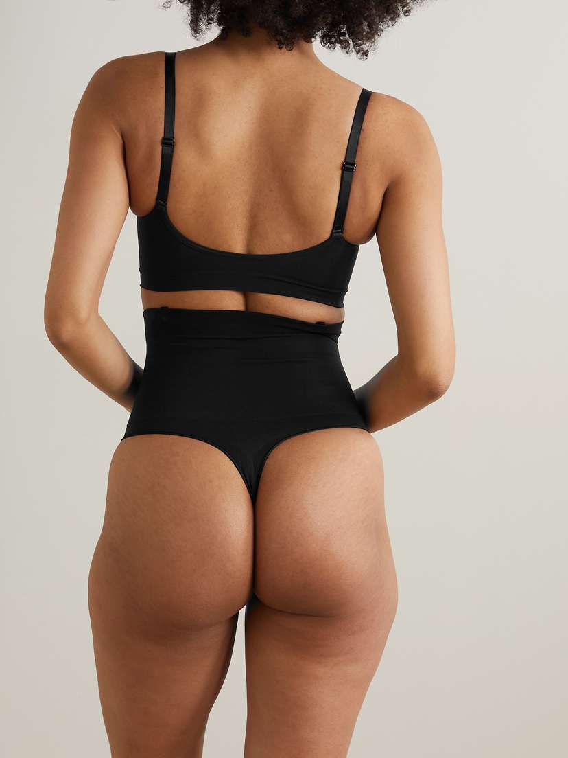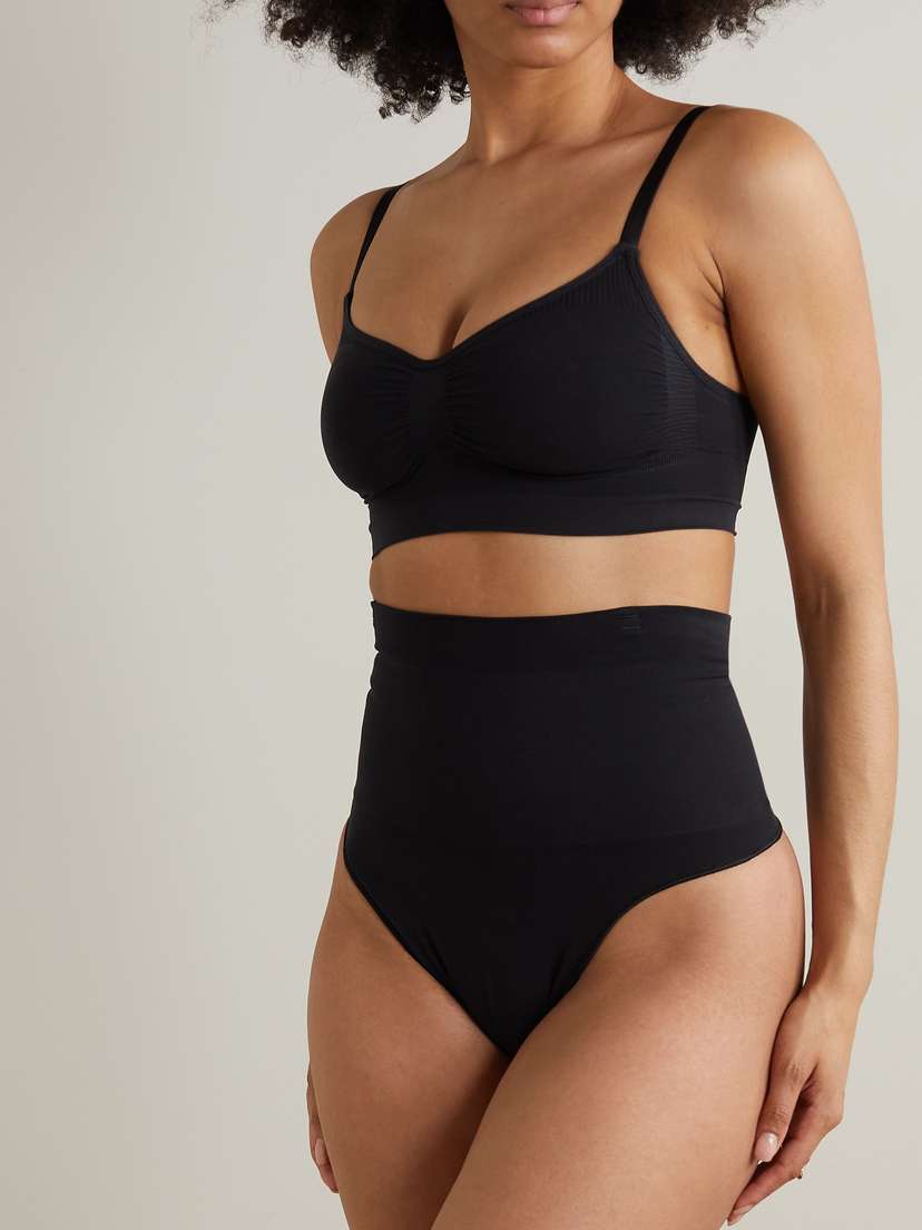 Бренд: Skims Цвет: черный Идея запустить линию корректирующего белья возникла у Ким Кардашьян более десяти лет назад, когда она постоянно кроила, шила и красила свои модели. Эти стринги, результат тщательного тестирования и разработки тканей, входят в линейку «Core Control» и разработаны так, чтобы быть незаметными под одеждой. Команда бренда утверждает, что они «сглаживают и плотно облегают» живот, обеспечивая поддерживающую компрессионную посадку. Двойной пояс и силиконовая полоска сзади обеспечивают надежную фиксацию.
