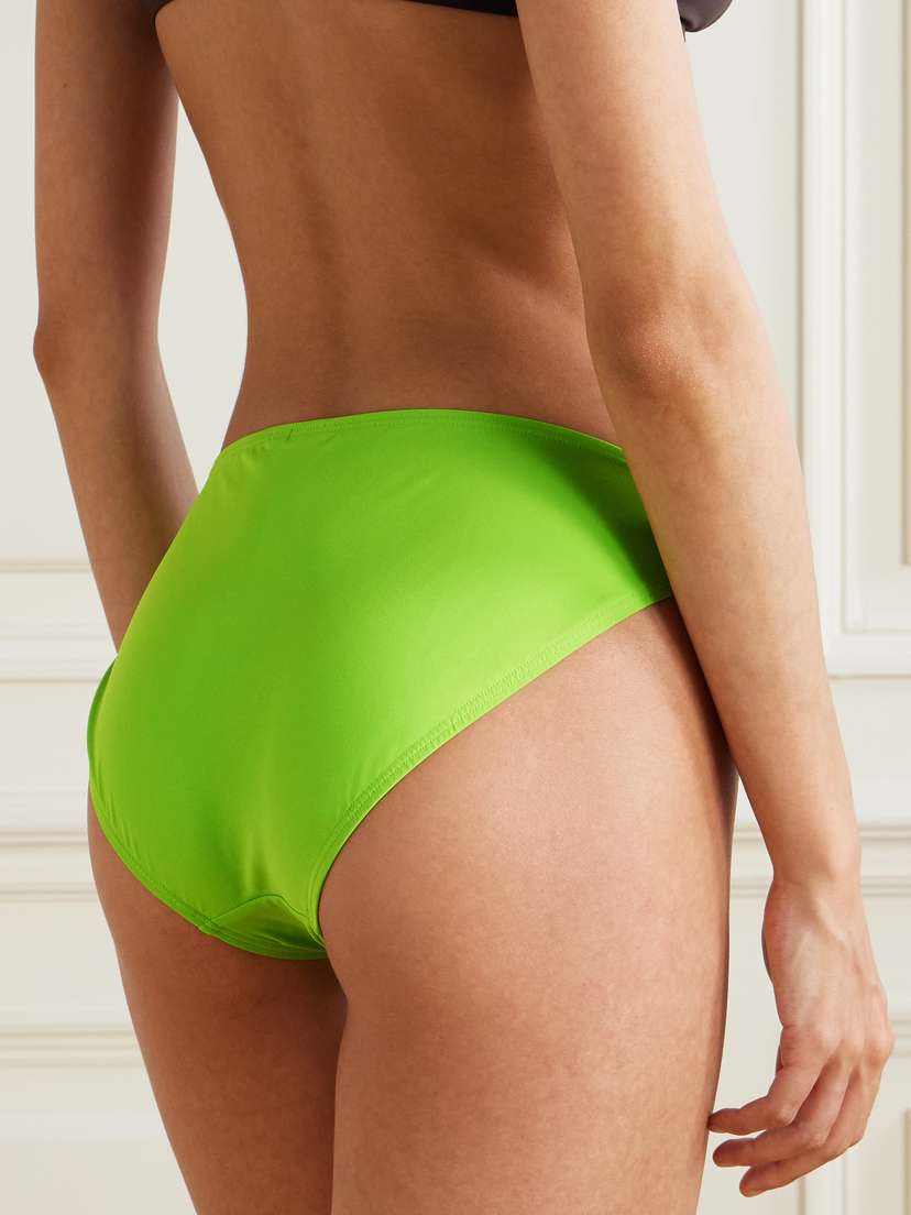 Плавки-бикини Tory Burch имеют классический хипстерский крой с низкой посадкой. Они сшиты из эластичной ткани лаймово-зеленого цвета и украшены вышитой эмблемой в тон сбоку.