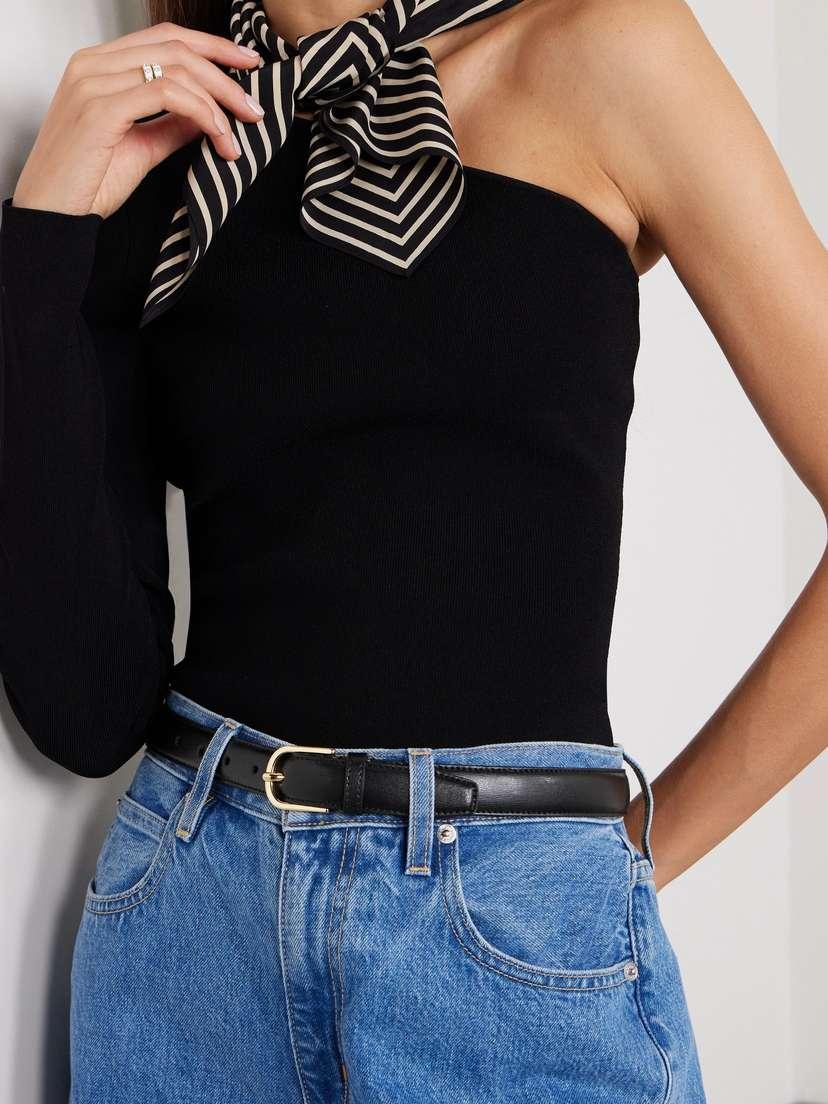 Дополните любой образ ремнем TOTEME. Он изготовлен из гладкой черной кожи с золотистой пряжкой, на которой выгравировано название бренда. Благодаря лаконичному дизайну его можно сочетать практически с чем угодно.