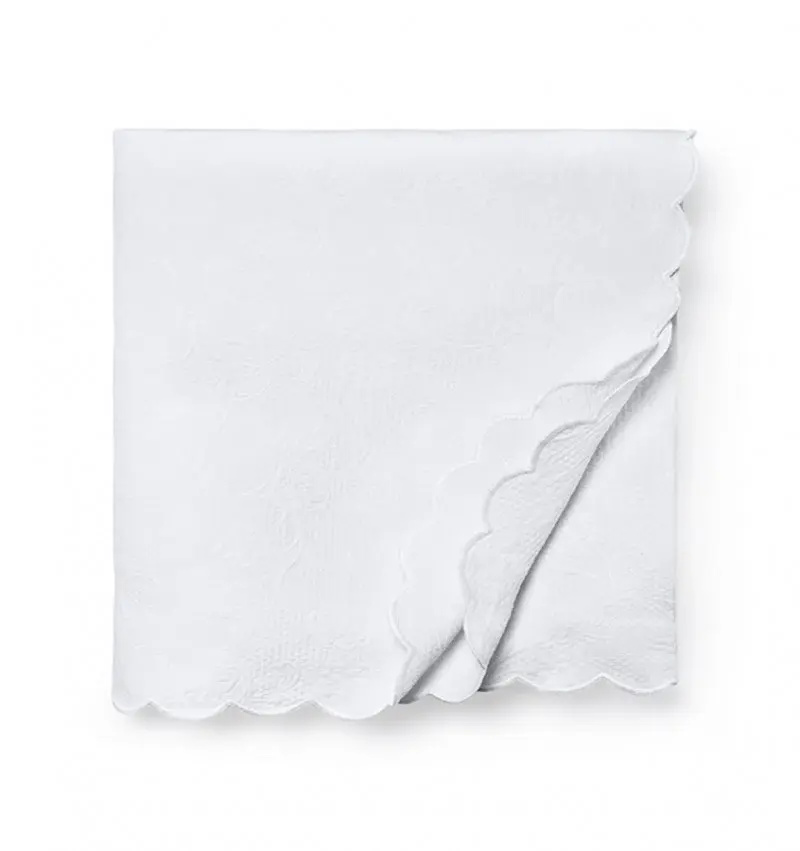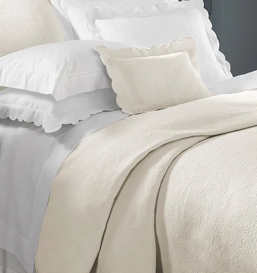 В классической традиции мателассе тонкий рельефный узор цветов и виноградных лоз на фоне текстурированной ткани, все из мягкого длинноволокнистого хлопка. Зубчатые края обрамляют покрывала и наволочки.