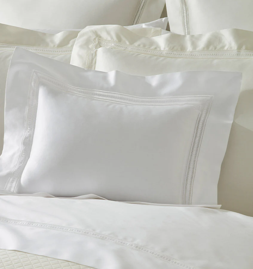 Наш роскошный гладкий сатин, Giotto, является основой для нашего ансамбля с кружевными украшениями, Diamante, где макраме-кружево вставлено по центру и обшито узкой атласной лентой. Чтобы добавить завершающий блеск и патину, кружево проложено с обеих сторон нежной вышивкой, создавая прекрасно утонченную и элегантную постель.