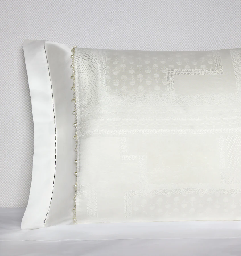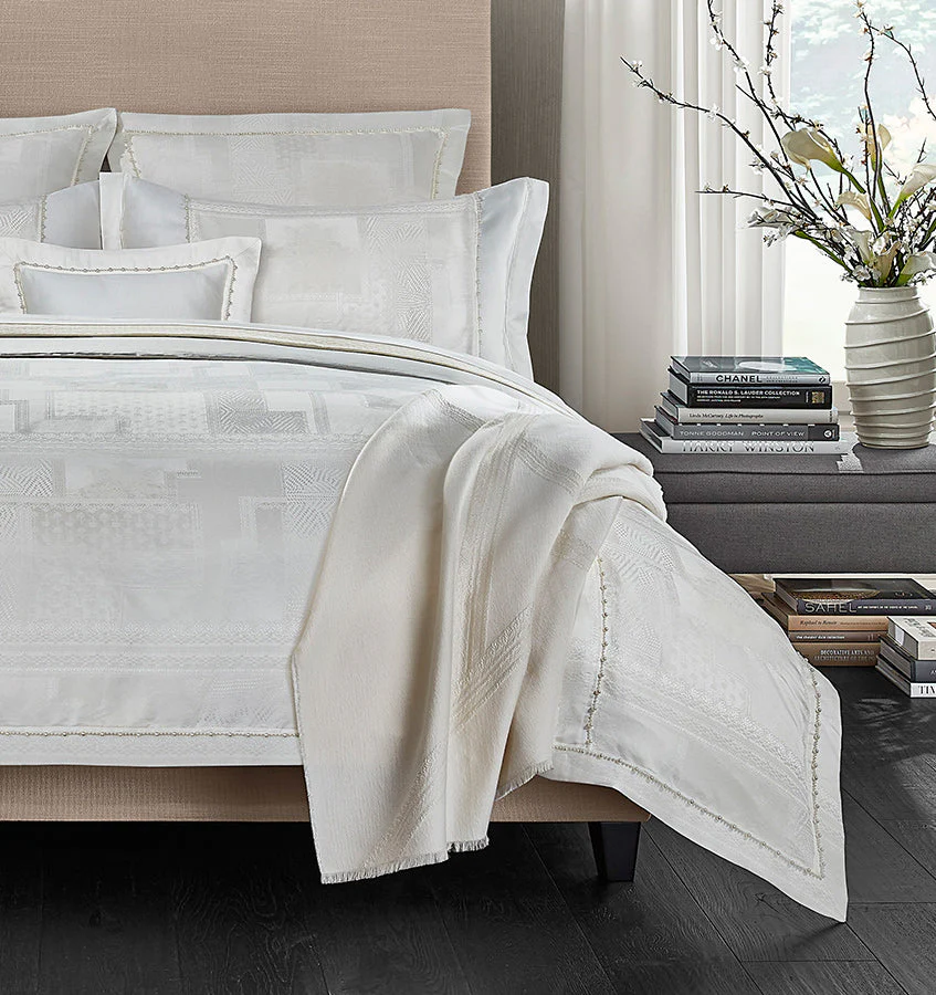 Вдохновленный изысканным люксовым кружевом Европы, Регина сочетает шелковые и льняные нити в великолепном жаккардовом узоре. Панели слоями покрыты кружевом, создавая тонкий эффект лоскутного шитья, и отделаны красивой жемчужной окантовкой, которая нежно отражает светлое сияние этой цветовой гаммы при свечах. Ограниченная серия из 5 экземпляров.