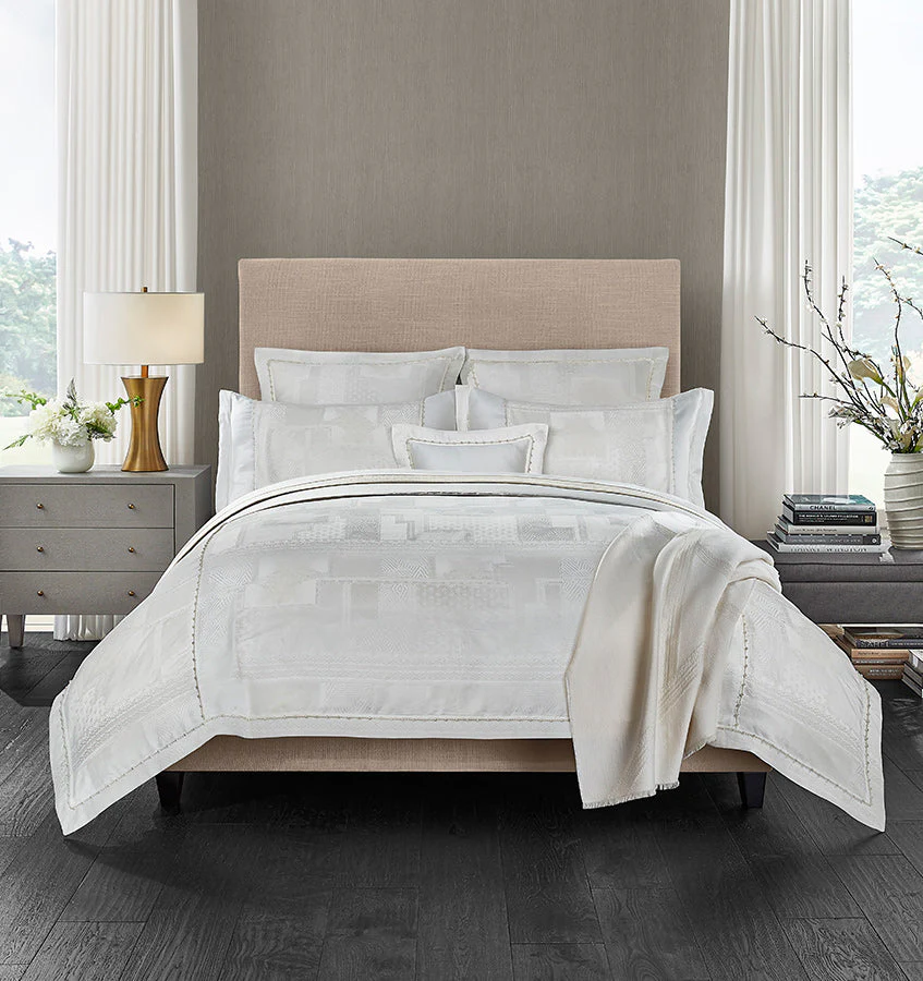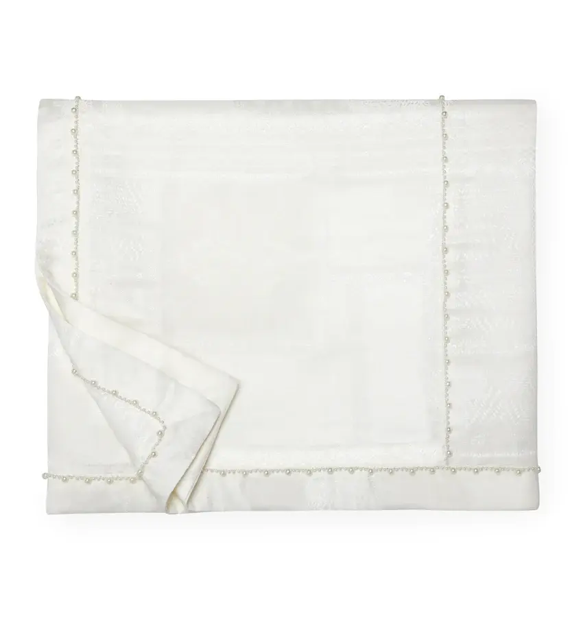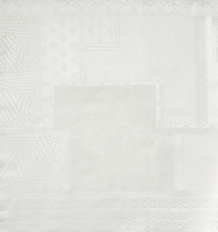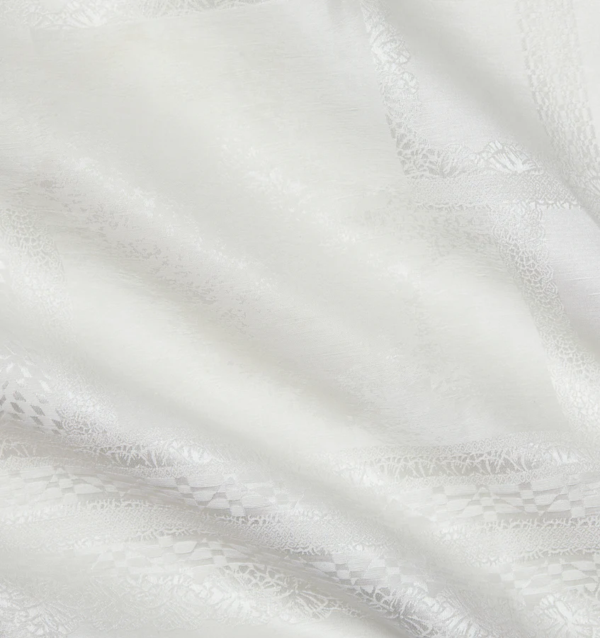 Вдохновленный изысканным люксовым кружевом Европы, Регина сочетает шелковые и льняные нити в великолепном жаккардовом узоре. Панели слоями покрыты кружевом, создавая тонкий эффект лоскутного шитья, и отделаны красивой жемчужной окантовкой, которая нежно отражает светлое сияние этой цветовой гаммы при свечах. Ограниченная серия из 5 экземпляров.