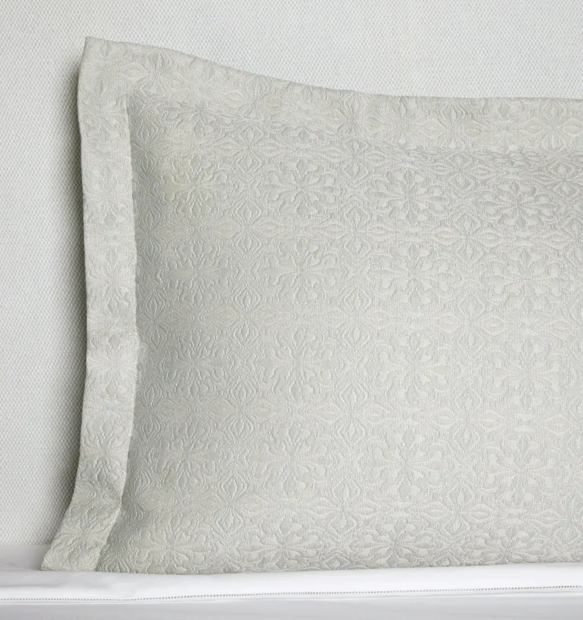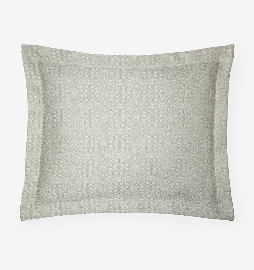 Отсылка к многовековым мотивам плитки, сложный узор Вероли выкрашен в пряже и ткань в Италии в мягкое, прозрачное и легкое покрывало и наволочки.