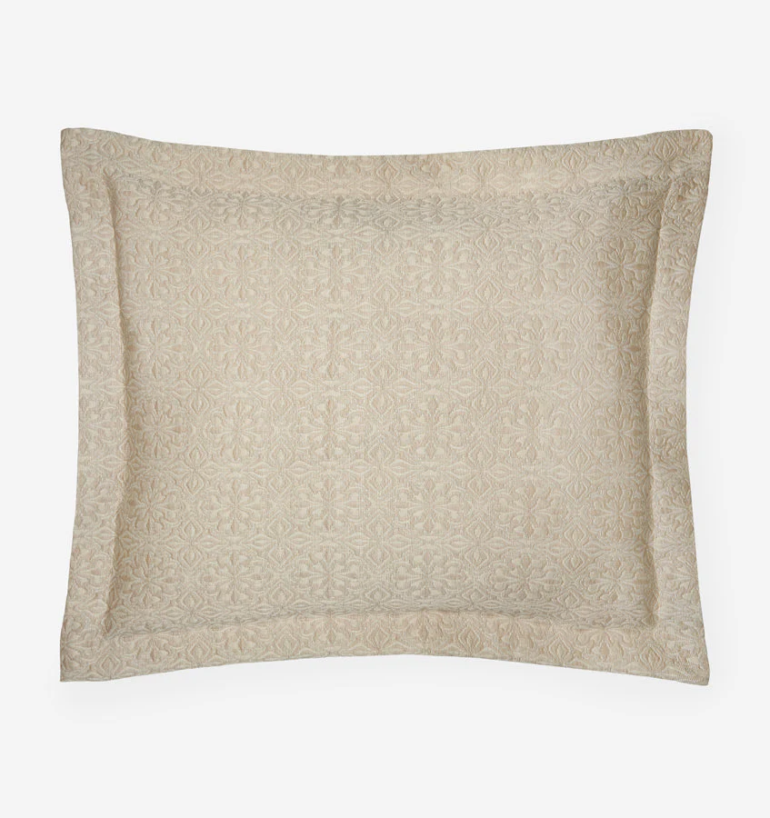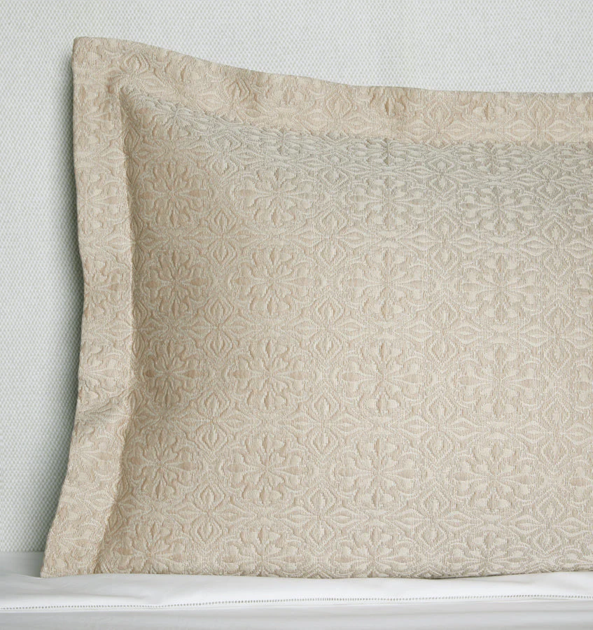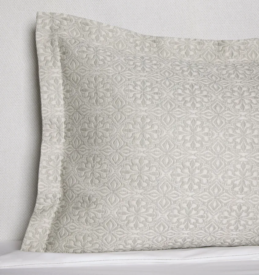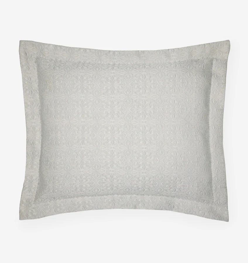 Отсылка к многовековым мотивам плитки, сложный узор Вероли выкрашен в пряже и ткань в Италии в мягкое, прозрачное и легкое покрывало и наволочки.