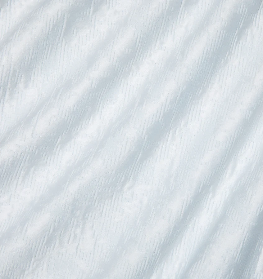 Текстура Альдино с пятнистым узором создается наложением абстрактного sateen переплетения на линейный фон, что создает мечтательную поверхность, напоминающую сверкающие воды, орошающие каменистые горные ручьи.