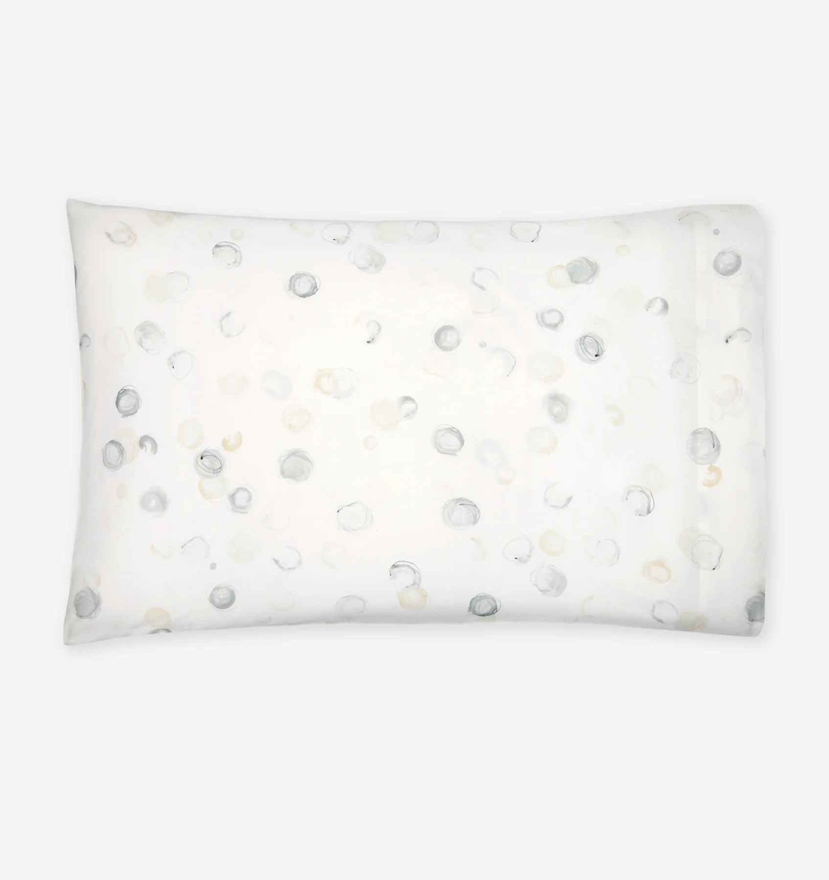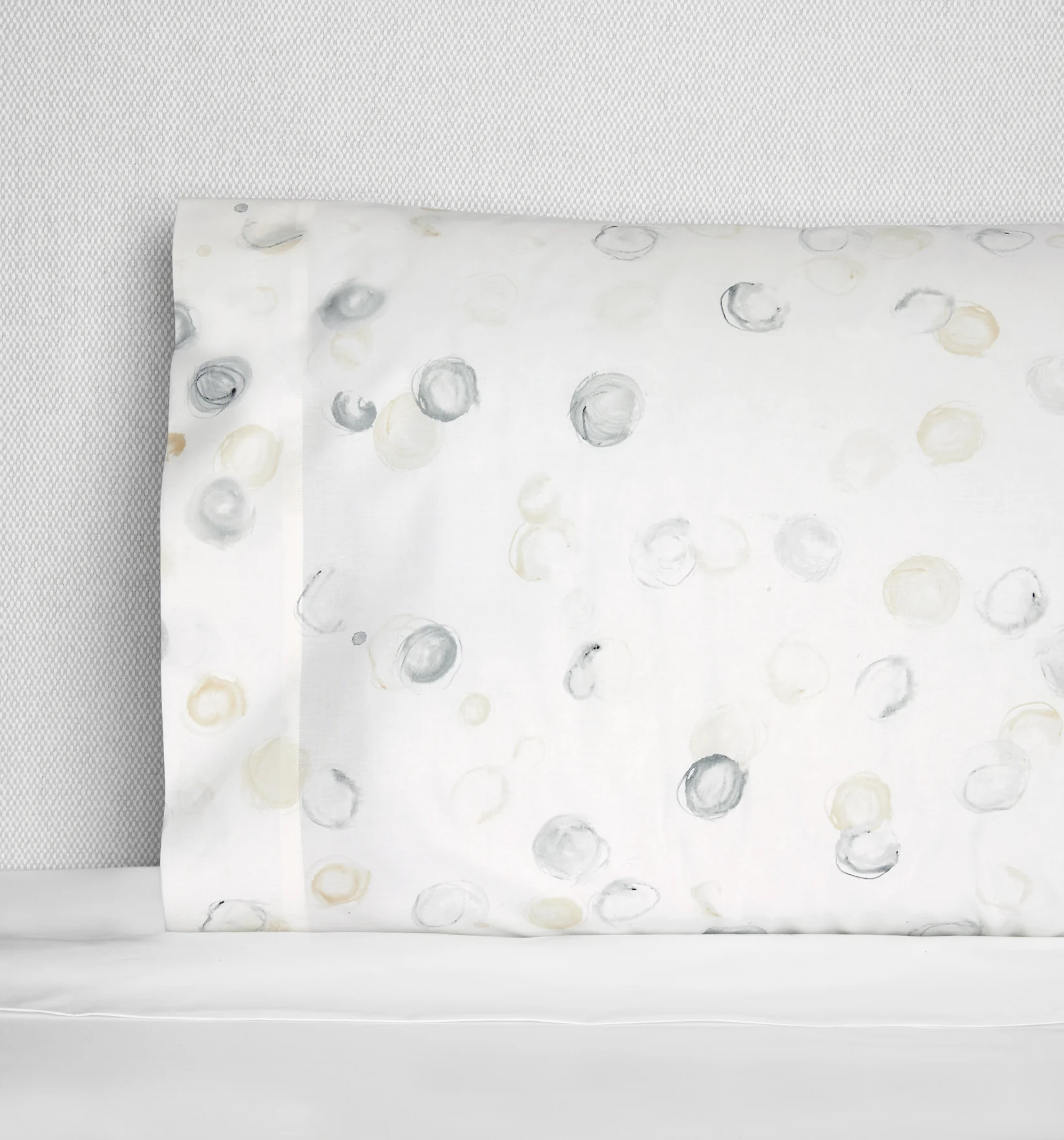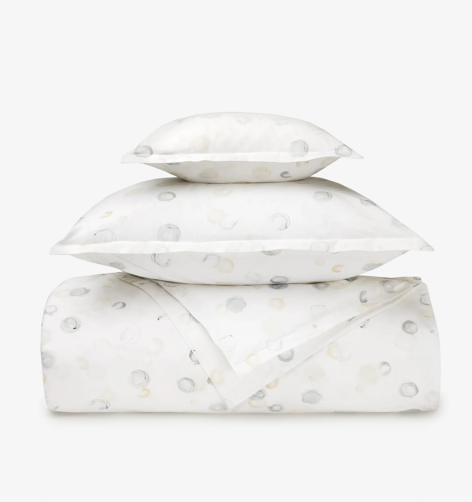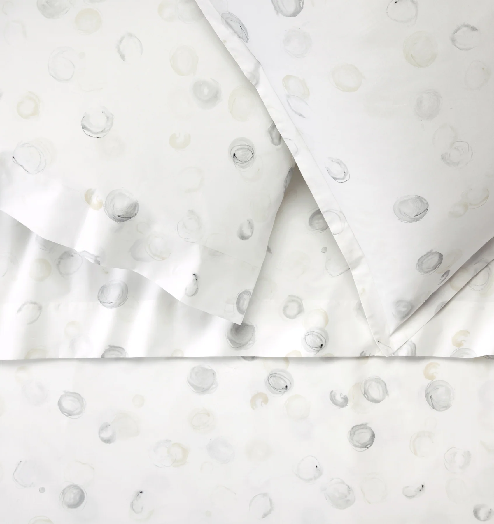 Нанесенные на ткань оттенки серого и таупе создают общий узор на чрезвычайно мягкой и воздухопроницаемой перкали основного материала Punti. Координирующая коллекция вышитых изделий Squillo объединена двумя линиями серого и таупе, которые образуют игривые петли, танцующие вокруг четырех сторон. Вместе коллекции добавляют игривую современность к классическому горошку, поднимая интерьер спальни и наполняя его сдержанным оживлением.