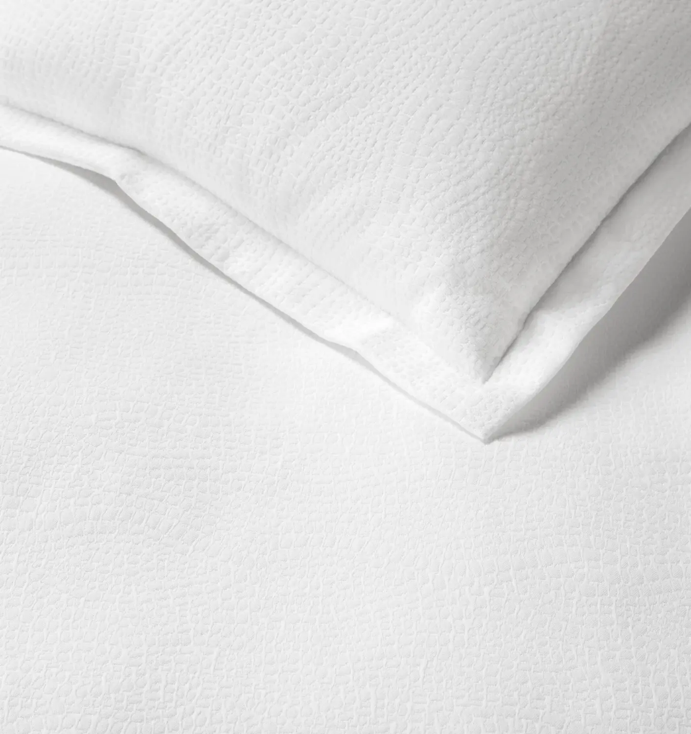Созданная в Португалии из чистого хлопка длинного волокна, коллекция Cobblestones от SFERRA x Scalamandré была вдохновлена греческим городом Мистрас с его живописными булыжниками. Общий жаккардовый мозаичный узор течет как ритмичный мотив, создавая спокойный, но динамичный холст, который превращает кровать в произведение искусства.