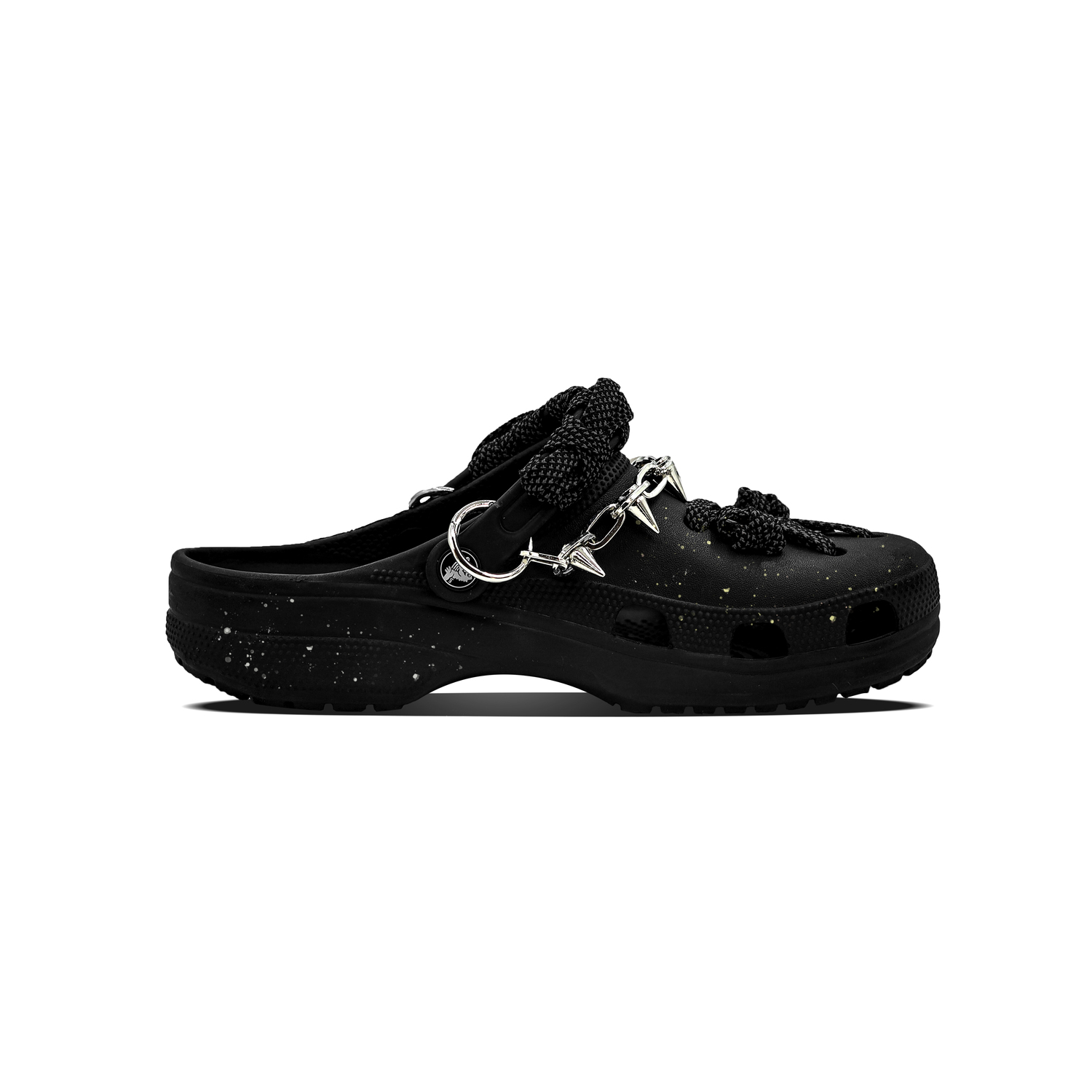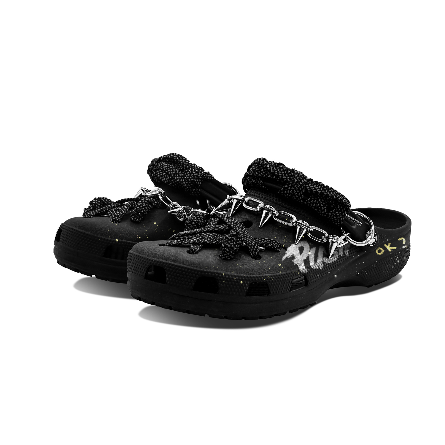 Данная кастомизированная обувь создана на основе оригинальной модели Crocs Classic Clog унисекс в глянцевом черном цвете, артикул: 10001-001. Модель с перфорацией воплощает концепцию «минимализм и крутой стиль»: полностью черная основа дополнена серебристой металлической цепью и индивидуальными принтами, создавая прогрессивную обувь, сочетающую уличную моду с практичностью.
