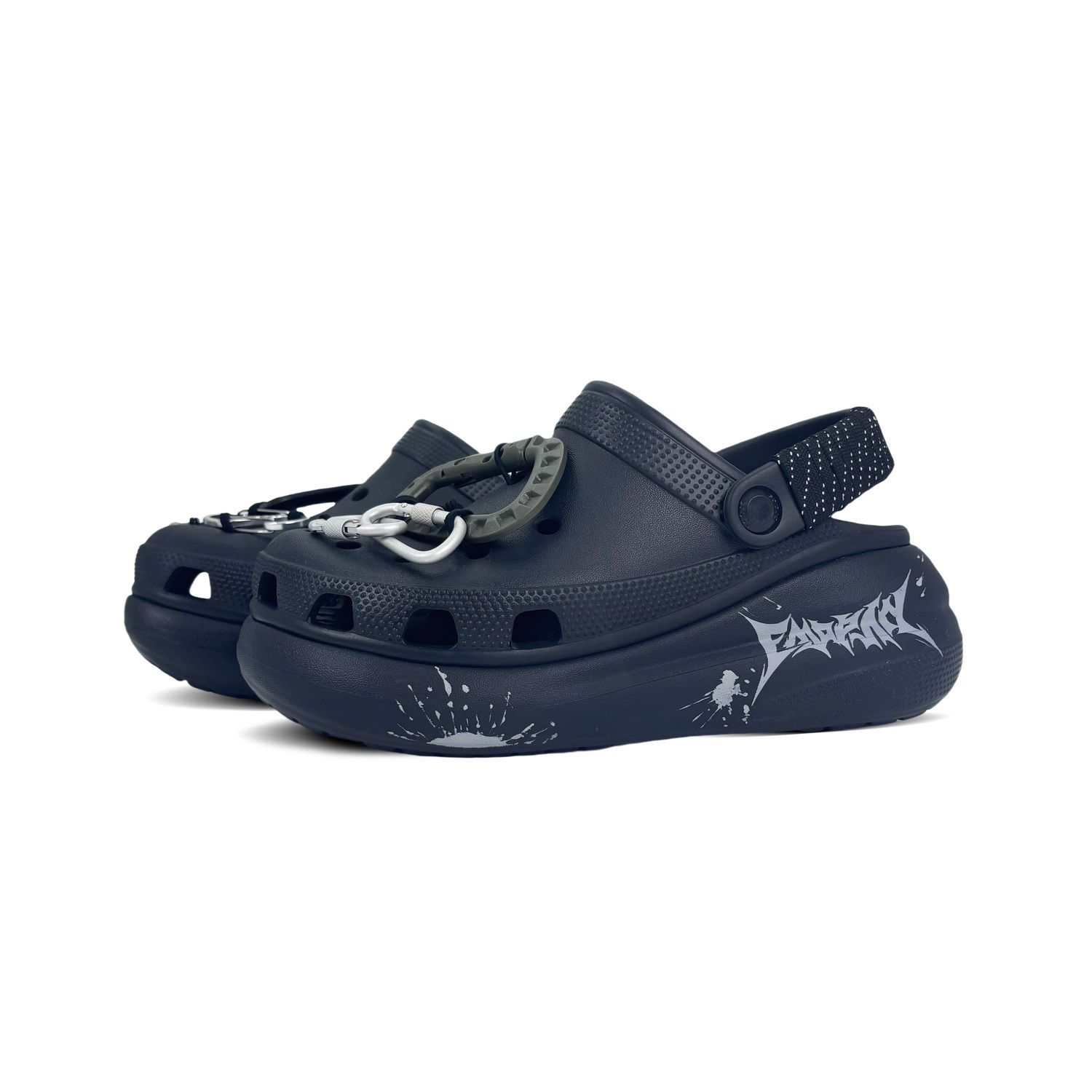 Данная версия кастомной обуви создана на основе унисекс-модели Crocs с артикулом 207521-001 (черный цвет). Дизайн вдохновлен альпинистскими карабинами в стиле хайкинга и активного отдыха. Задняя часть украшена граффити-надписями и другими элементами, что придает модели индивидуальность, сохраняя при этом износостойкость и легкость. Небольшие детали на подошве добавляют композиции объемности. На изображении представлена фотосъемка реального продукта — цвет может незначительно отличаться от фактического. Вся кастомная обувь изготавливается вручную, поэтому каждая пара имеет небольшие уникальные особенности. Материалы верха, строчка и трафаретная печать соответствуют оригинальной заводской отделке и не являются частью кастомной обработки.