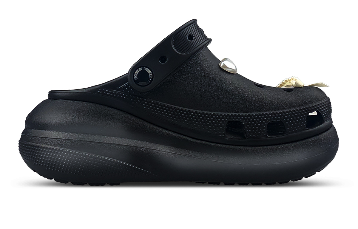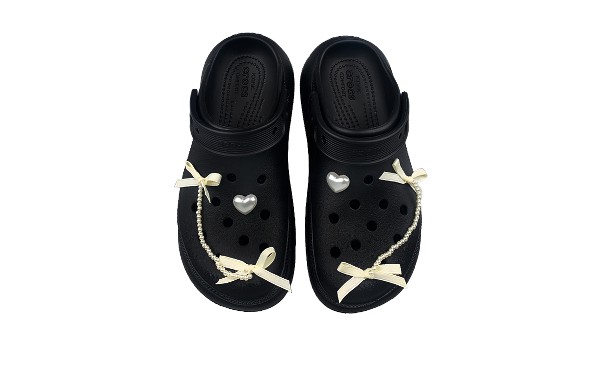 Эта кастомная версия обуви создана на основе оригинальной модели Crocs Crush Clog, артикул 207521-001 черный. Вдохновением послужили элементы бантика и жемчуга — классические символы нежности, которые искусно интегрированы в дизайн обуви, создавая выраженный омолаживающий эффект. При этом полностью черный корпус кроссовок, с элементами готической мрачной таинственности, разбавляет слащавый стиль, формируя контрастное сочетание милого и крутого.