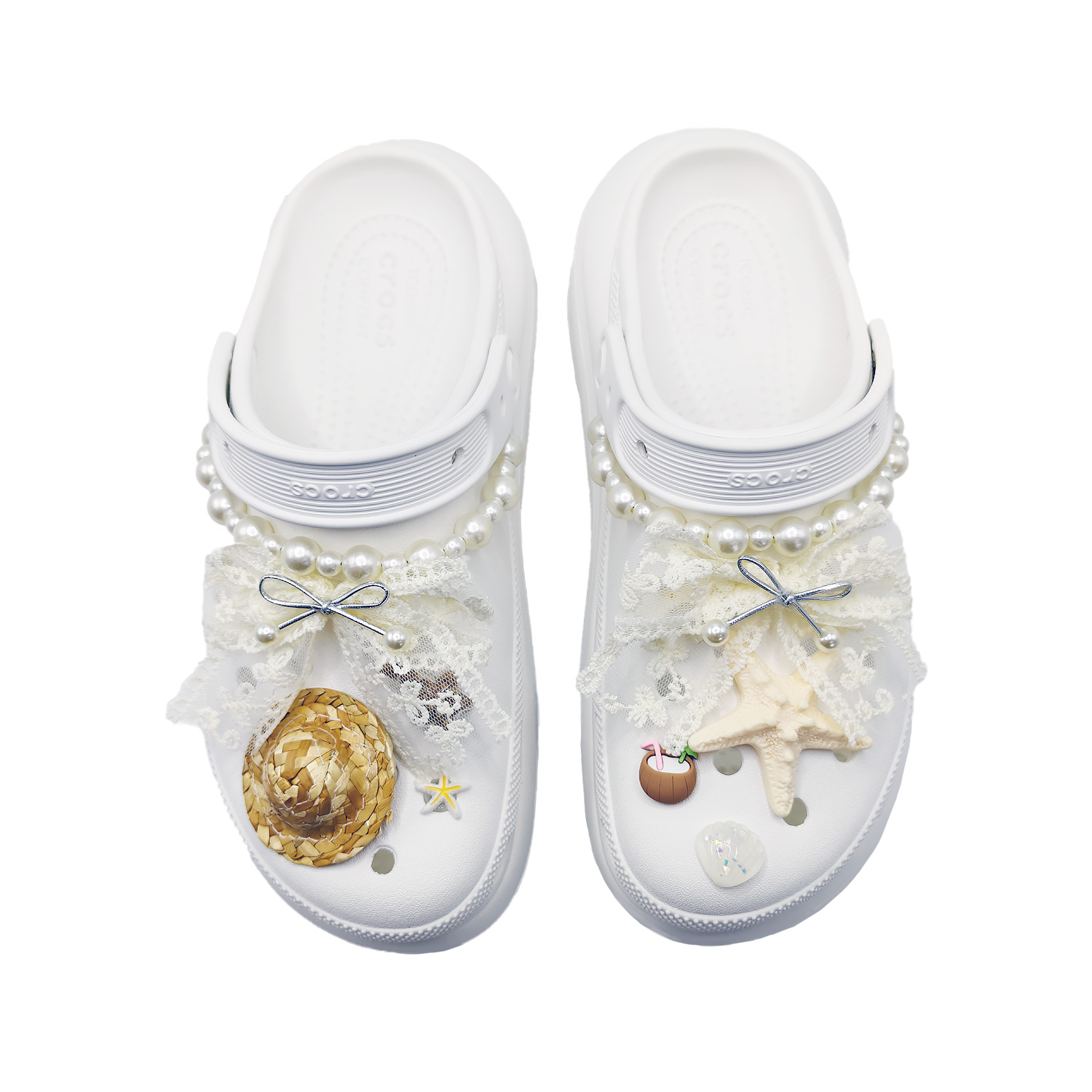 Данная пара кастомной обуви создана на основе оригинальной модели Crocs с артикулом 207521-100. Дизайн этих перфорированных туфель вдохновлён темой «Летняя вечеринка» и сочетает в себе модные элементы с минималистичным стилем. Основной цвет обуви — классический белый, символизирующий гармонию простоты и современности, а белые логотипы добавляют нотку загадочности. Умелое сочетание оттенков белого органично интегрирует модные акценты в трендовую модель. На изображении представлена фотография реального продукта, поэтому возможны незначительные отклонения в цвете. Вся кастомная обувь изготавливается вручную, и каждая пара может иметь небольшие индивидуальные различия. Материалы, строчка и печать нанесены в соответствии с оригинальной заводской отделкой и не относятся к процессу кастомизации.