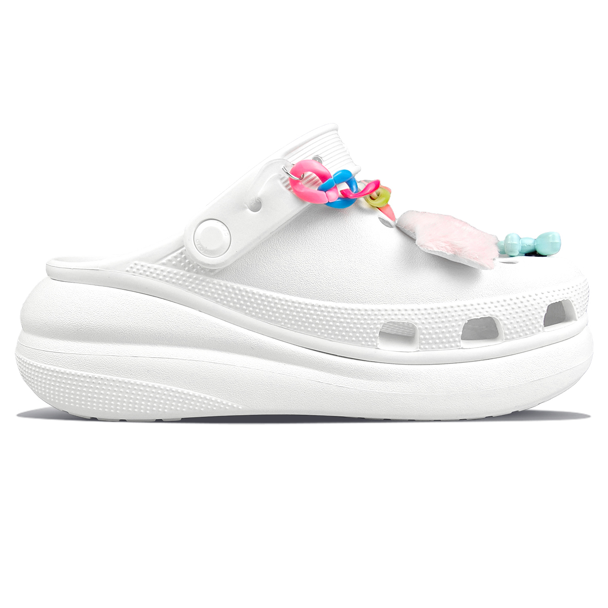 Данная кастомизированная версия обуви создана на основе оригинальной модели Crocs Crush Clog EVA — унисекс-модели «Пуф» с перфорацией, высотой подошвы 5,2 см, белого цвета, артикул 207521-100. Дизайн вдохновлён темой влюблённости щенков, передавая микро-момент таяния радужных конфет во рту — когда мягкость облачной подошвы сталкивается с энергией растворяющейся радуги. Фотография является съёмкой реального продукта, фактический цвет может незначительно отличаться. Вся кастомизированная обувь изготавливается вручную, поэтому каждая пара имеет небольшие индивидуальные отличия. Материалы верха, строчки и принты относятся к оригинальной заводской отделке и не являются частью процесса кастомизации.