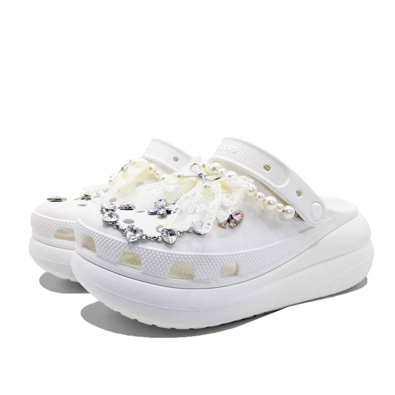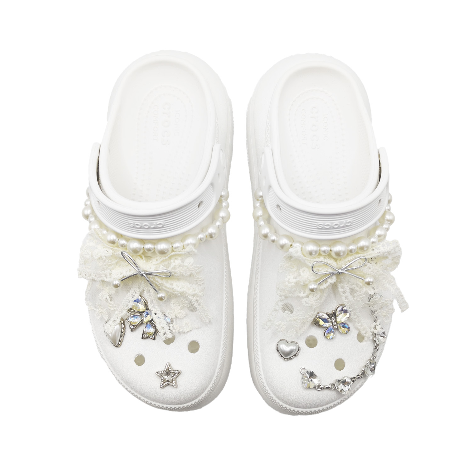 Данная модель кастомной обуви создана на основе оригинальной модели Crocs с артикулом 207521-100. Дизайн этой перфорированной обуви под названием «Сияющее имя» сочетает в себе элементы моды и стиль минимализма. Основной цвет верха — классический белый, символизирующий гармонию простоты и современности. Умелое сочетание белого цвета органично интегрирует модные элементы в трендовую модель обуви. На изображении представлена реальная съемка, при этом фактический цвет может незначительно отличаться. Вся кастомная обувь изготавливается вручную, поэтому каждая пара может иметь небольшие индивидуальные различия. Материалы верха, строчка и печать относятся к оригинальной заводской отделке обуви и не являются частью процесса кастомизации.