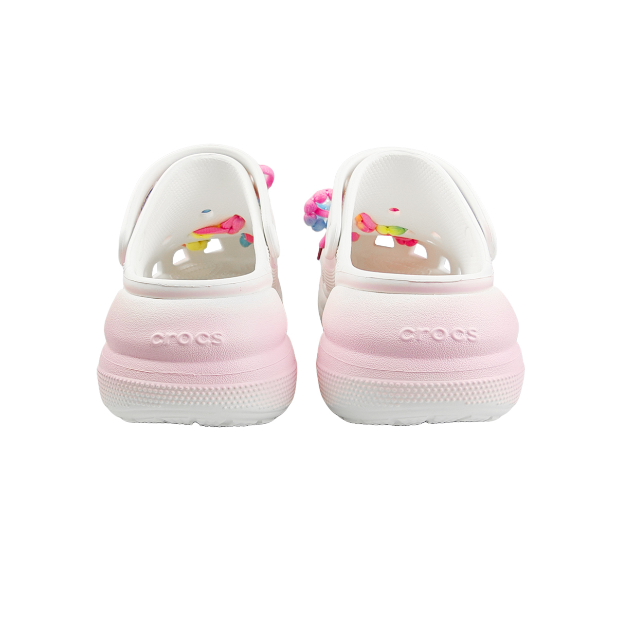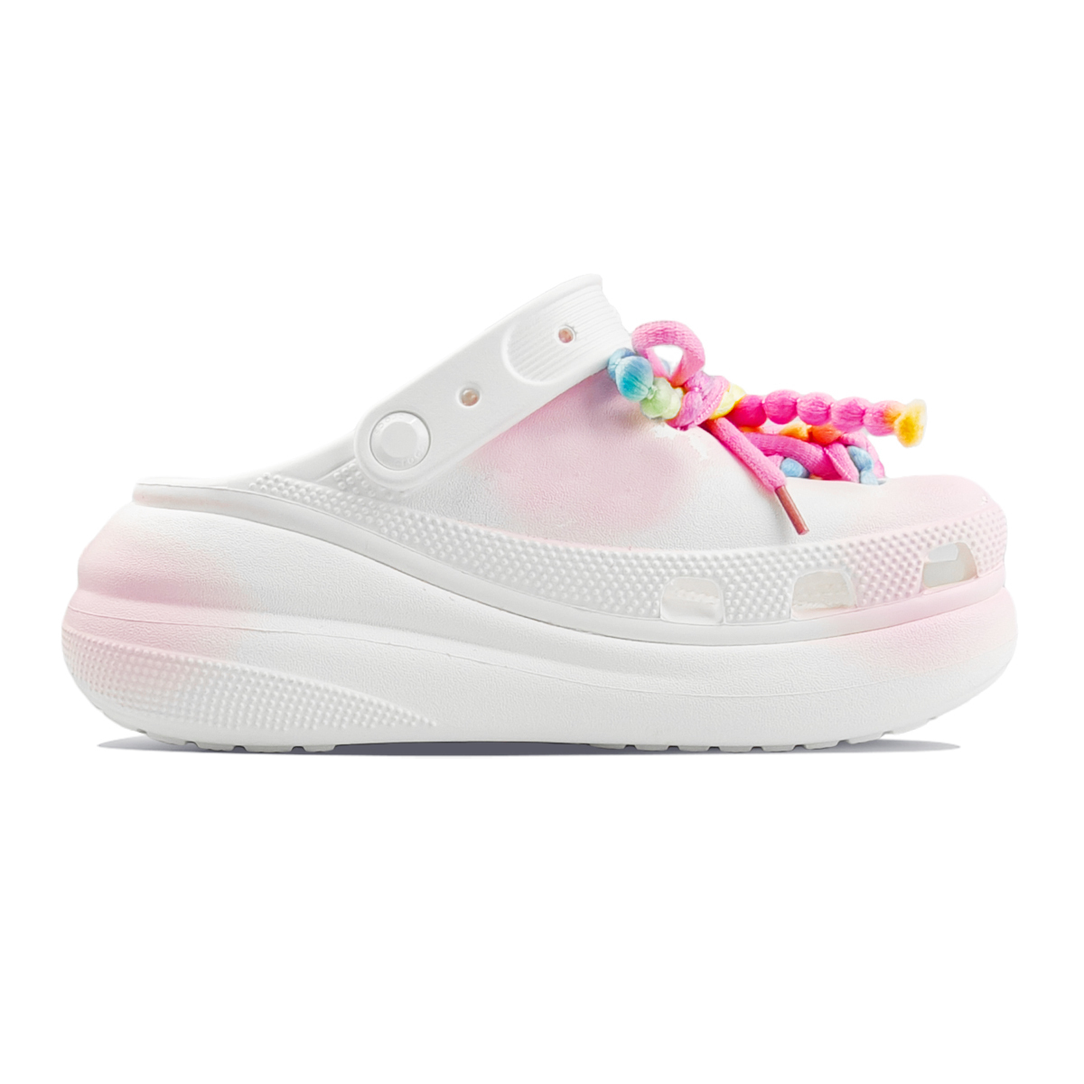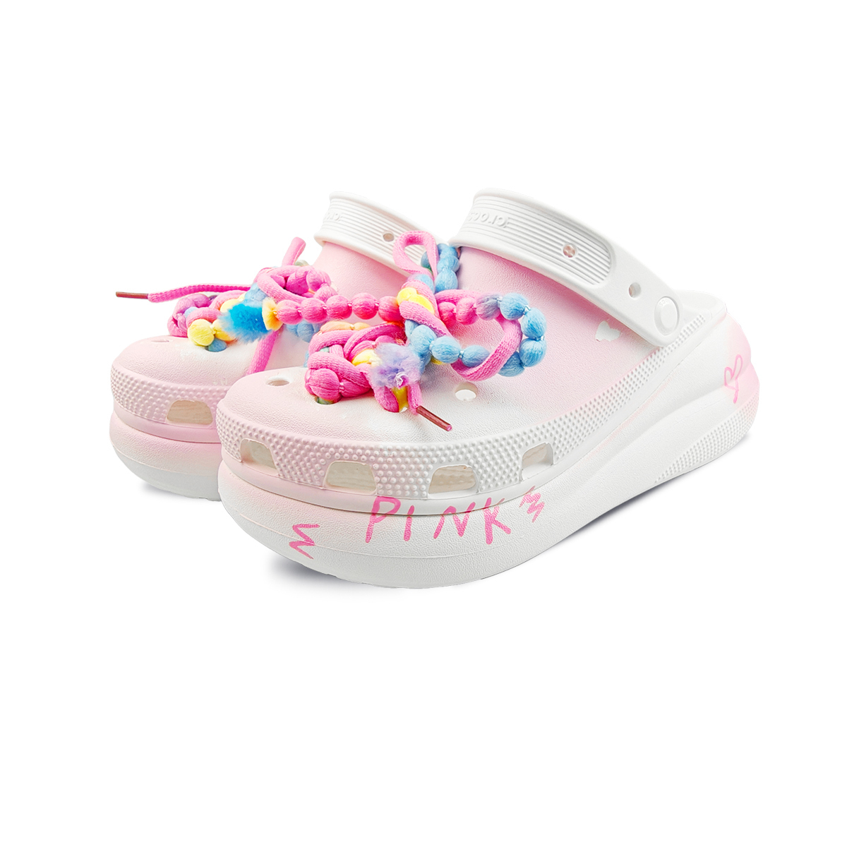 Данная кастомизированная модель дырявых тапочек (Crocs) выбрана на основе оригинальной модели Crocs Crush Clog, женская версия, основной артикул: 207521-100, белый цвет. Без толстой подошвы дырявые тапочки теряют свою душу! Модель с радужными цветами слишком уникальна — надень их и станешь Y2K-девушкой! Белый цвет универсален, как можно обойтись без пары прохладных дырявых тапочек летом? Фотография сделана с реального товара, цвет может незначительно отличаться. Все кастомизированные тапочки изготавливаются вручную, каждая пара имеет небольшие отличия. Материал верха, строчка, трафаретная печать и другие детали относятся к заводской отделке оригинальной обуви и не являются частью процесса кастомизации.