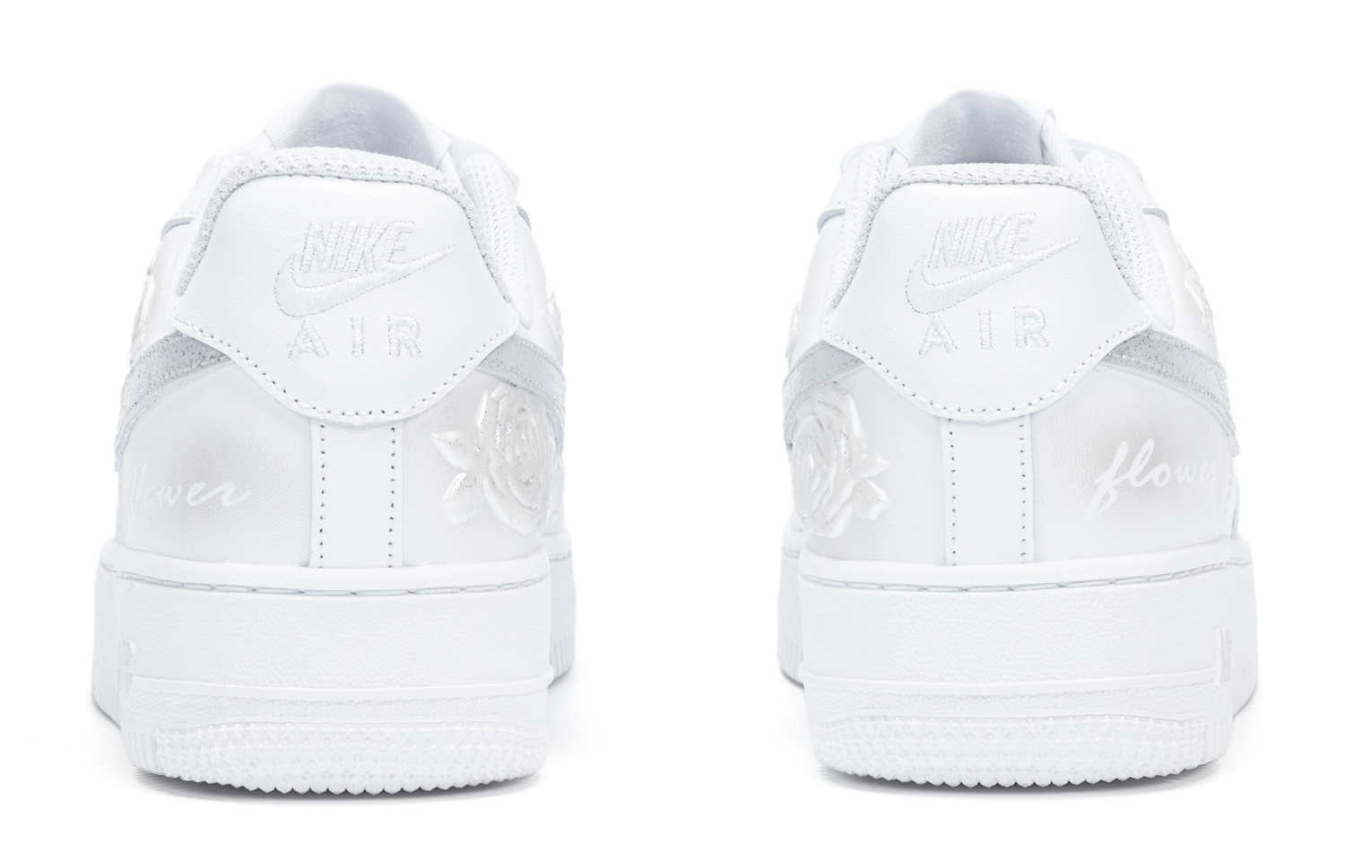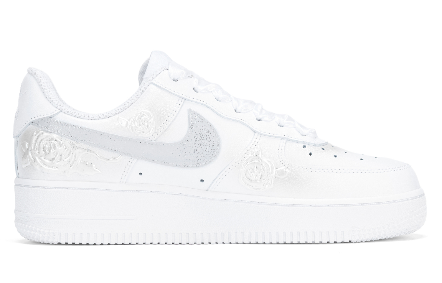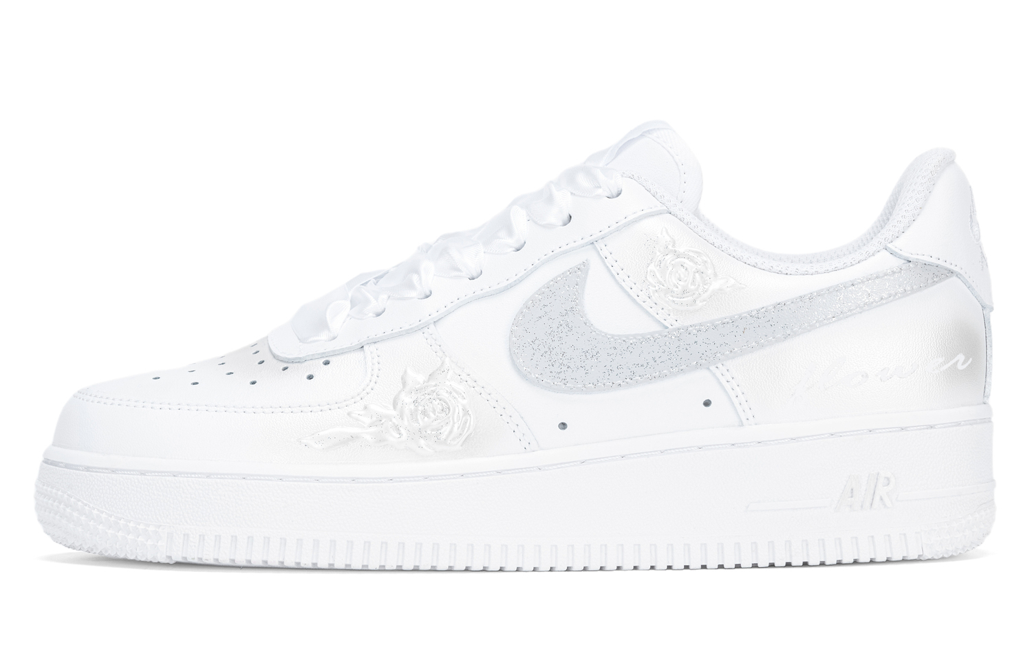 Эта кастомная пара оригинальных кроссовок выбрала артикул 315122-111. Вспомогательные артикулы: DH2920-111, FV5951-111, DD8959-100, CW2288-111. Основным дизайнерским языком стала объёмная роза, вырезанная на чисто белой поверхности обуви, создающая элегантную атмосферу. Роза на боковой части выполнена с использованием технологии объёмного нанесения, лепестки чётко слоистые, как рельефная скульптура, детали тычинок изысканны, под светом отражающие тонкую текстуру, что образует умелый баланс мягкости и твёрдости с чистой фактурой белой кожи. Серебристые блёстки на логотипе Swoosh, рассыпанные как звёздная пыль при лунном свете, привносят в整体 лёгкую роскошь; скрытый узор "flower" на боковой части перекликается с элементом розы, усиливая тематическое повествование. Дизайн旨在借立体玫瑰的浪漫符号,融合纯白基底的极简美学。