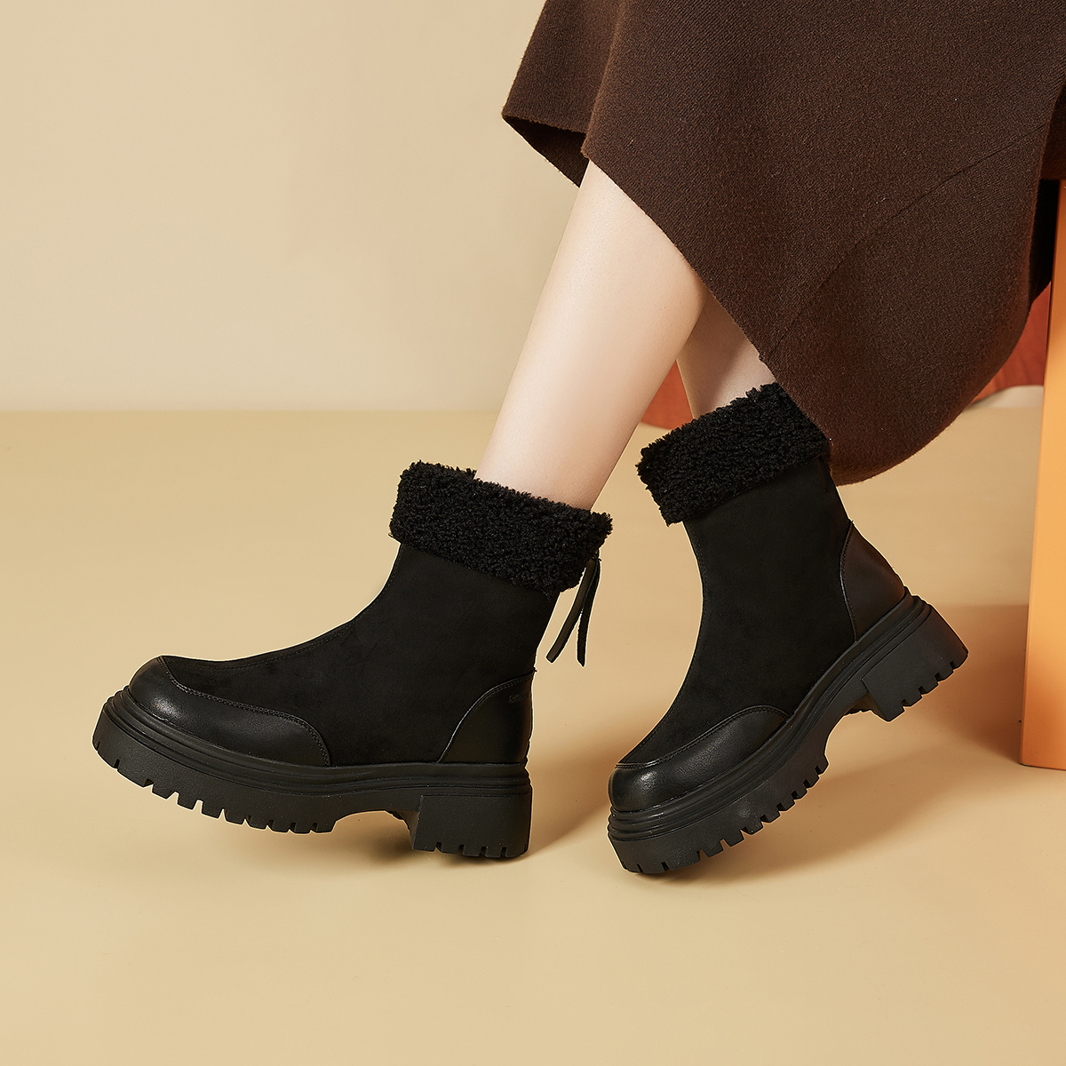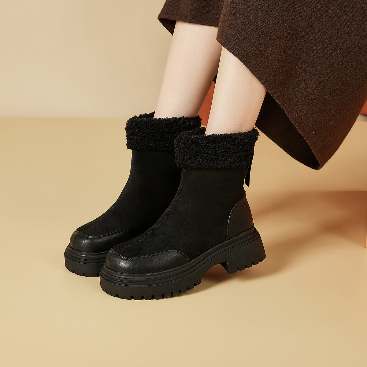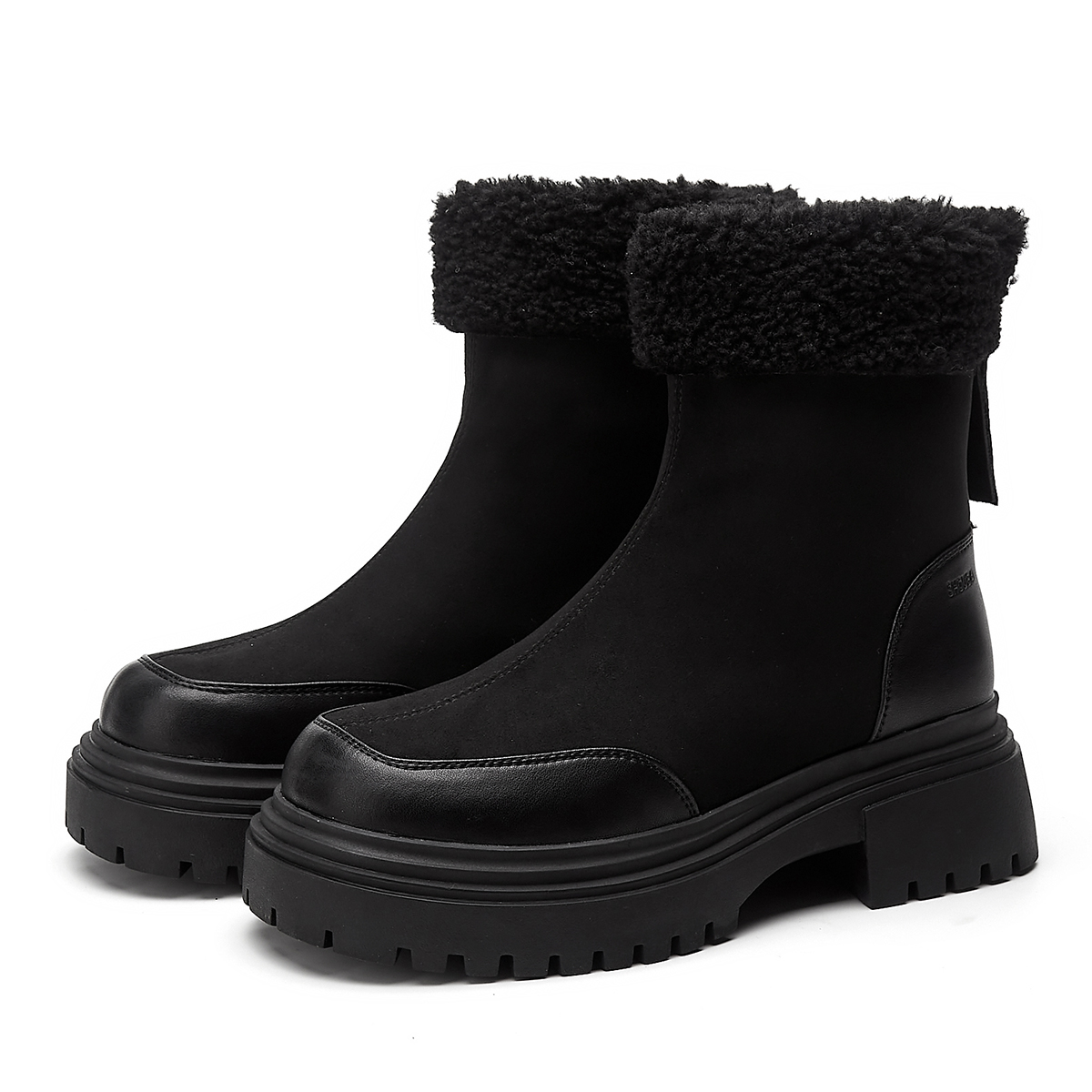 Круглый носок, модный и милый. Утолщенная подошва для увеличения роста и удлинения линии ног. Утепленный меховой внутренний слой для тепла и комфорта. Верх из комбинированной кожи с противоскользящим рисунком, красивый и безопасный. Идеальный выбор для зимних прогулок — тепло и стиль!