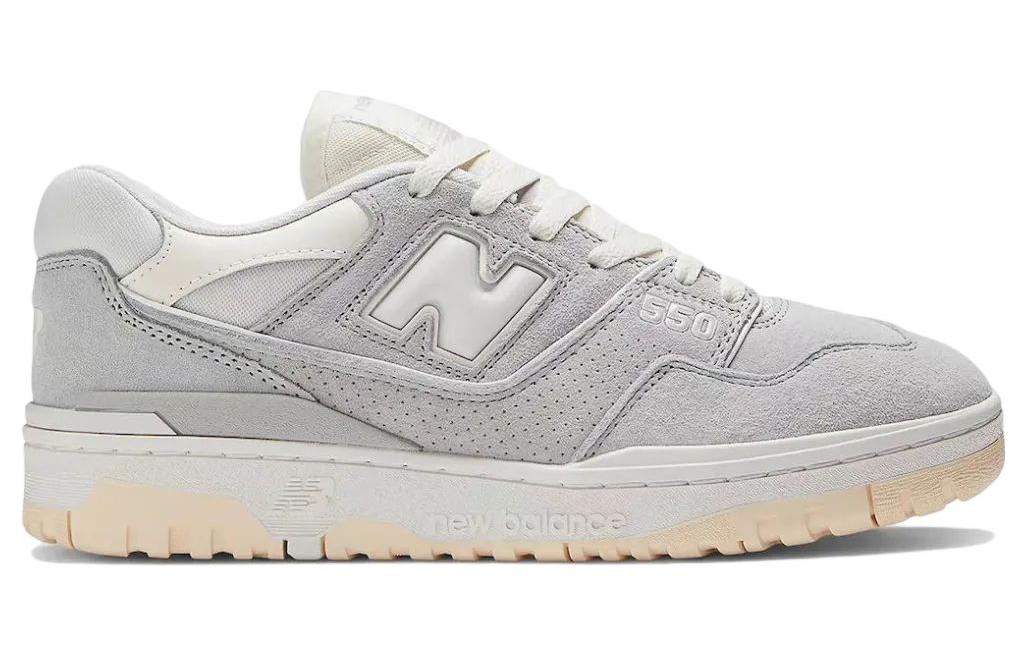 Эта модель New Balance 550 выполнена в цветовой гамме, включающей дождевые облака, морскую соль и белый цвет. Она изготовлена из комбинации кожи, сетки и замши, причем серый замшевый материал покрывает большую часть верха. Дизайн завершают фирменная надпись "550" и боковой логотип "N" на двухцветной резиновой подошве.