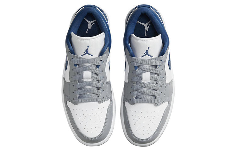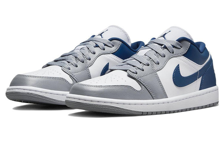 Эта модель Air Jordan 1 Low выполнена на белой кожаной основе с серыми накладками, при этом синий цвет покрывает логотип Swoosh и задник. Синяя подкладка, язычок с Jumpman и серыми шнурками, а также резиновая подошва поверх белой промежуточной подошвы завершают дизайн.