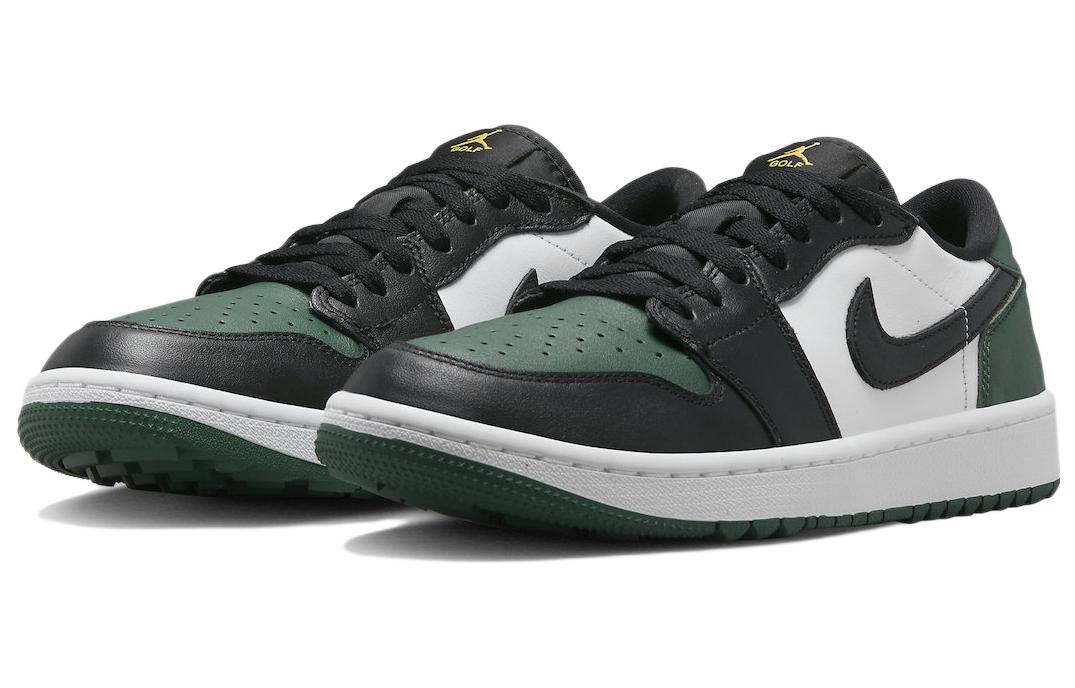 Модель Air Jordan 1 Low Golf выполнена из кожи с сетчатым язычком и подкладкой. Она имеет белую основу Noble Green и черные накладки. Черный цвет продолжается на язычке, шнурках и подкладке, а на белой промежуточной подошве и зеленой специализированной резиновой подошве для гольфа нанесены пыльцевые и белые фирменные логотипы.