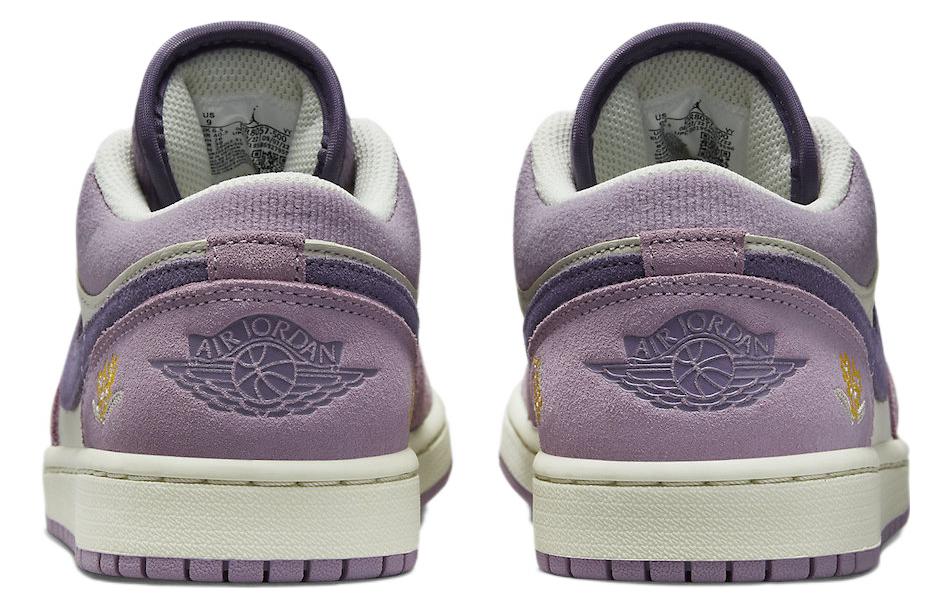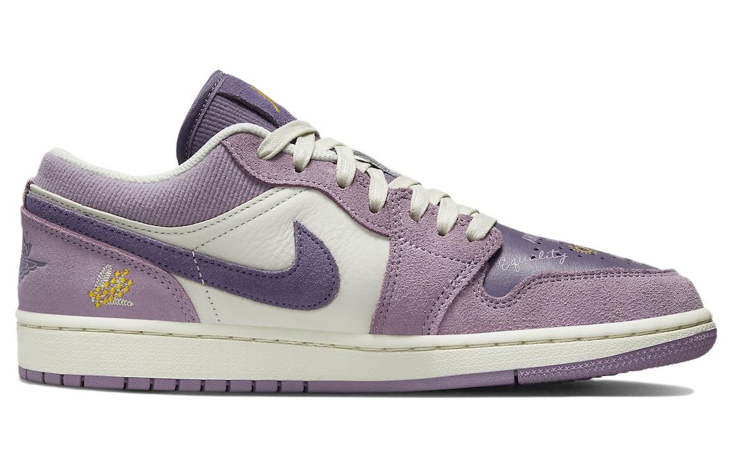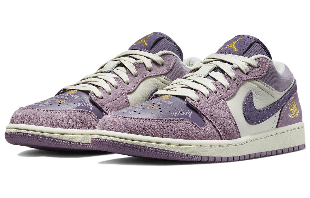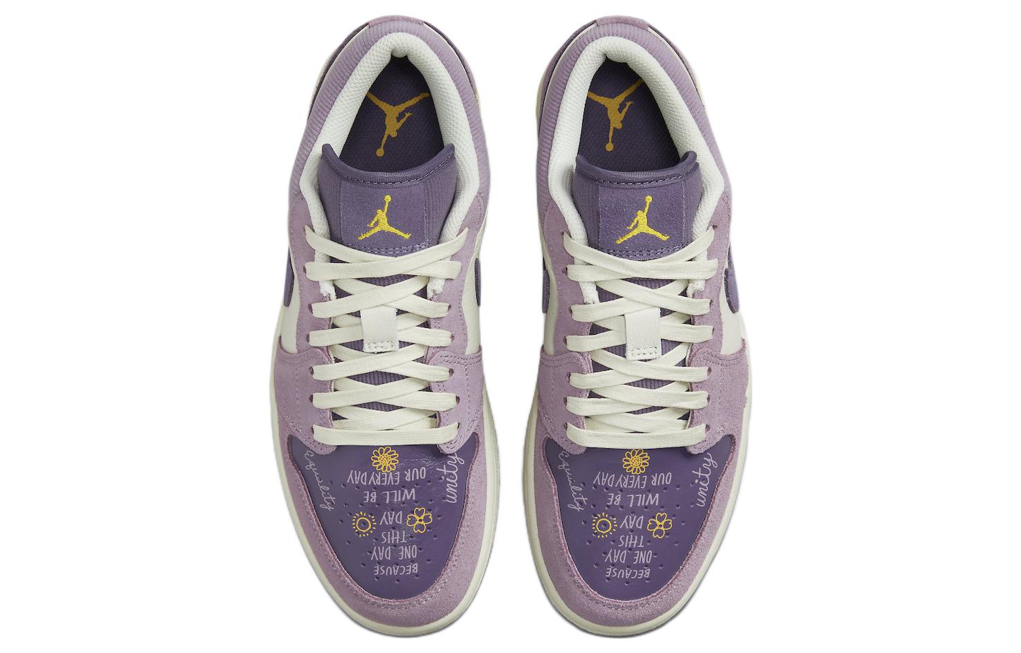 Эта модель Air Jordan 1 Low выполнена из комбинации кожи, замши и вельвета. Она представлена в фиолетовых и лиловых оттенках с контрастными желтыми акцентами. К примечательным деталям относится унифицирующее послание на носке, гласящее: «Потому что однажды этот день станет нашим каждым днём», а также гравировки «Единство» и «Равенство», завершающие дизайн.