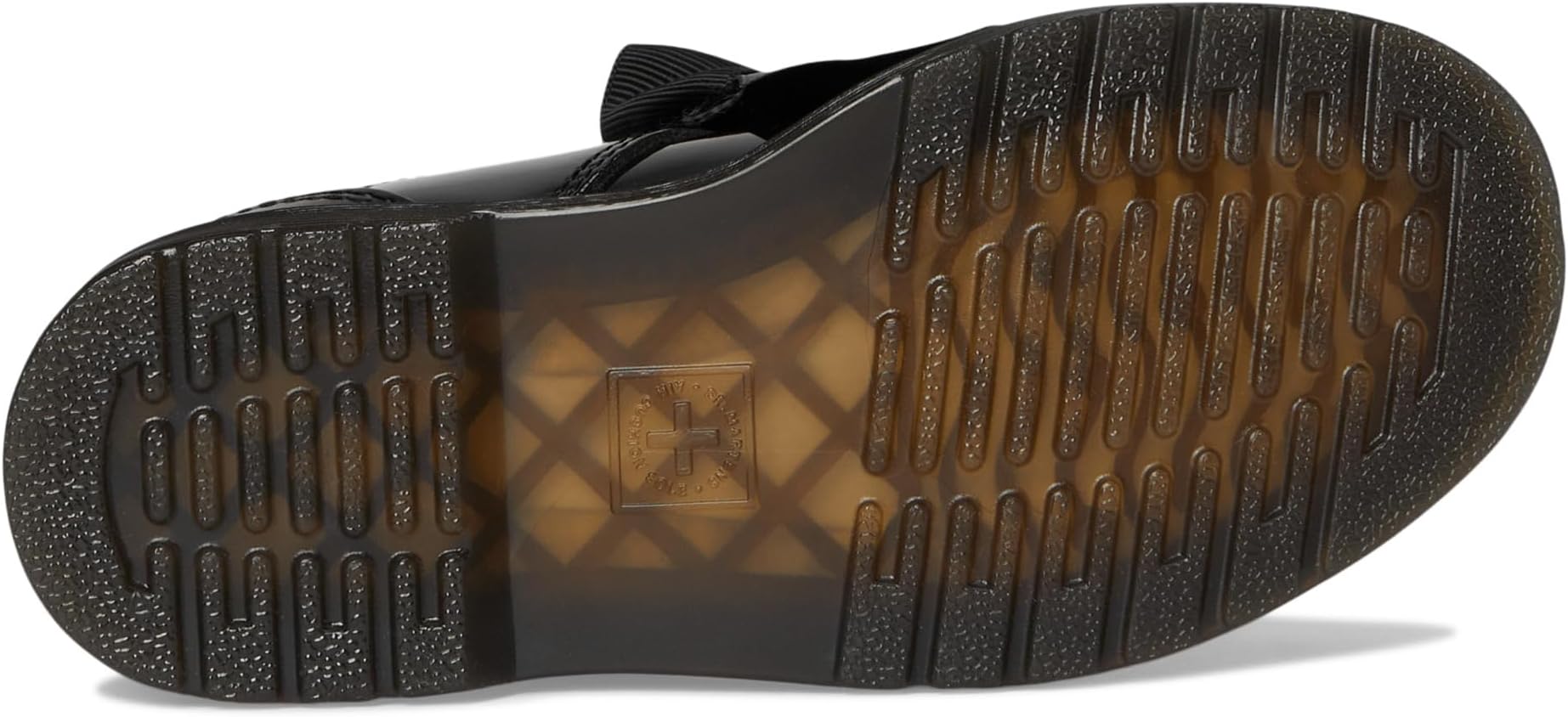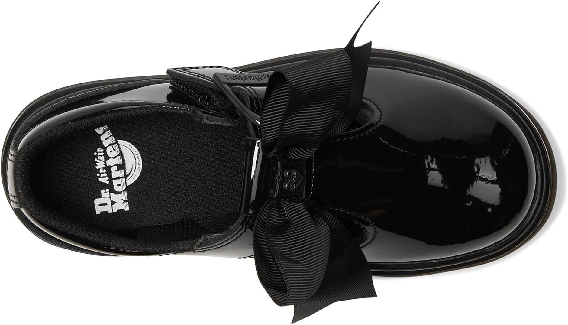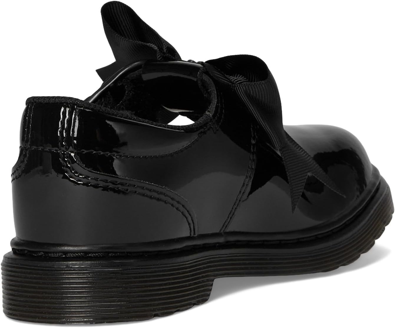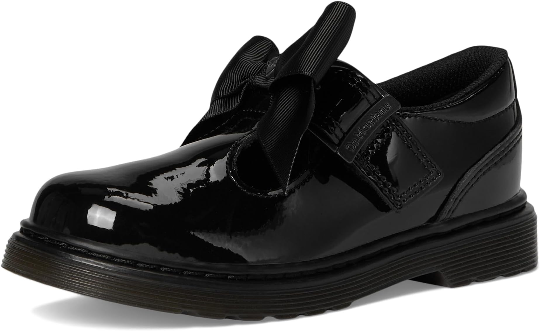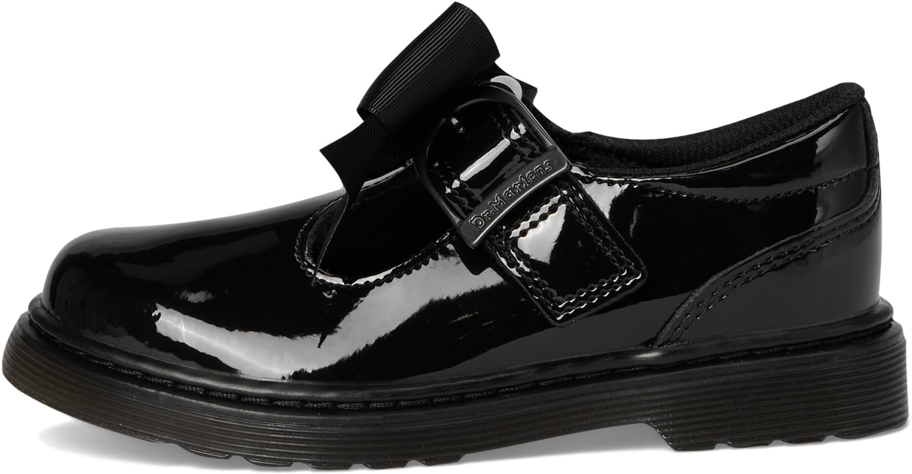 • Dr. Martens украсил эти классические школьные туфли Т-образным ремешком с липучкой и блестящей лакированной кожей. Эта пара идеально подходит для школы, украшенная чёрным бантом из репсовой ленты.