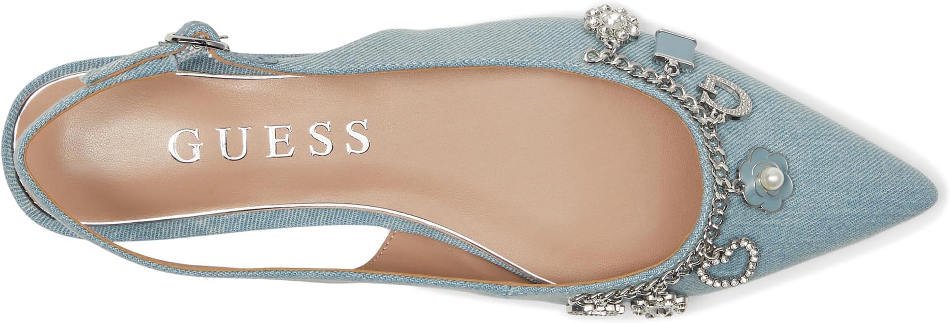 • Туфли Guess Daisee — это простой силуэт с открытой пяткой, дополненный модными нотками. Они украшены цепочкой на переднем носке и очаровательными подвесками Guess. Верх из резины, подкладка из синтетического каучука, острый носок, застежка на пряжке, низкий силуэт и плоская пятка.