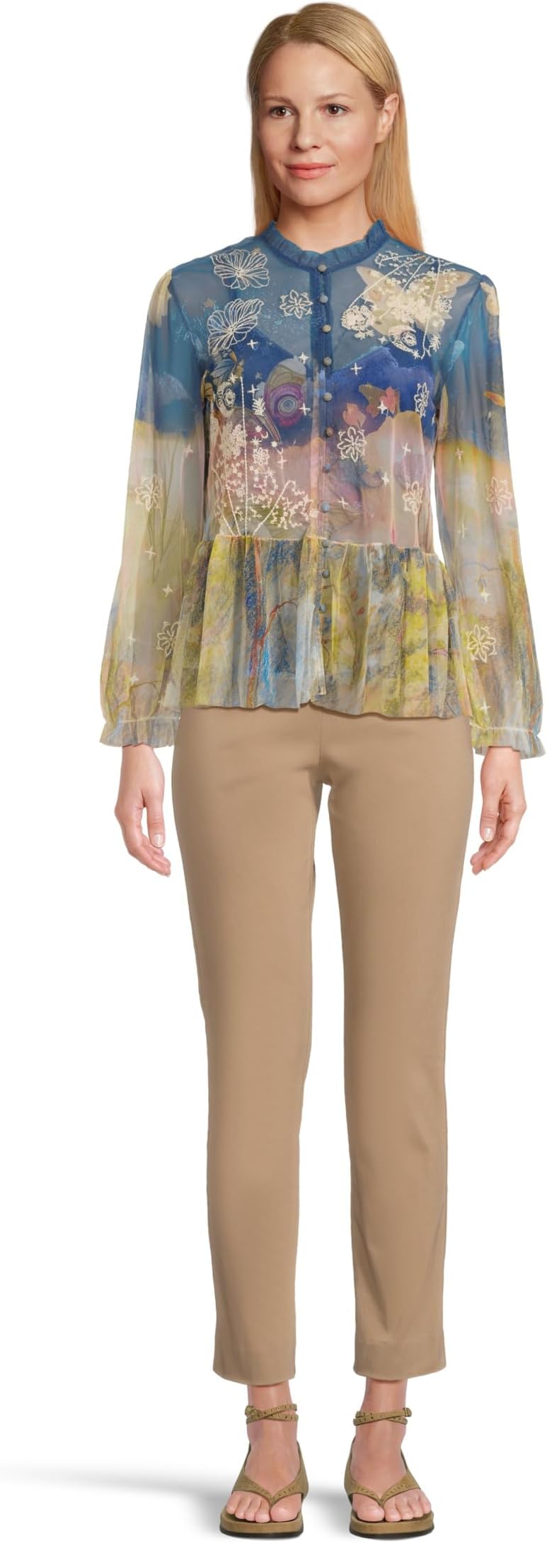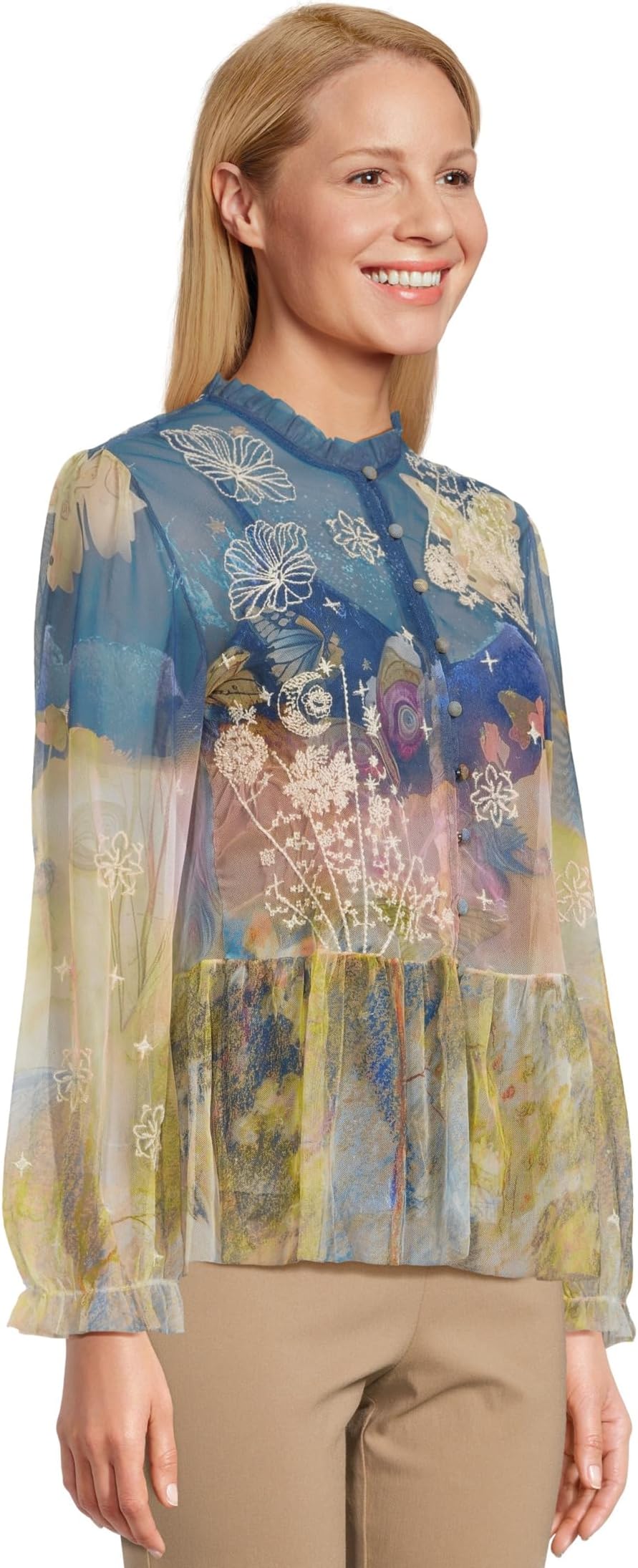 • Бохо-шик сочетается с непринужденной элегантностью в сетчатой блузке Johnny Was Charlot (с комбинацией), мечтательной вещи, призванной превратить повседневную одежду в форму искусства. Изготовленная из легкого сетчатого накладного слоя и комбинации для удобства надевания, эта блузка привлекает внимание своим ярким принтованным дизайном, который кажется одновременно вневременным и модным. Круглый вырез с застежкой на пуговицы спереди добавляет изящный штрих, а длинные рукава с эластичными манжетами вносят нотку романтики. Очаровательный оборчатый подол завершает образ, создавая грациозные движения при каждом шаге. Разработанная как модель без застежки, она обеспечивает удобство без ущерба для изысканности, что делает ее идеальным сочетанием комфорта и стиля.
