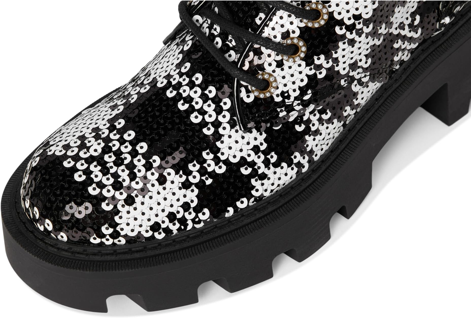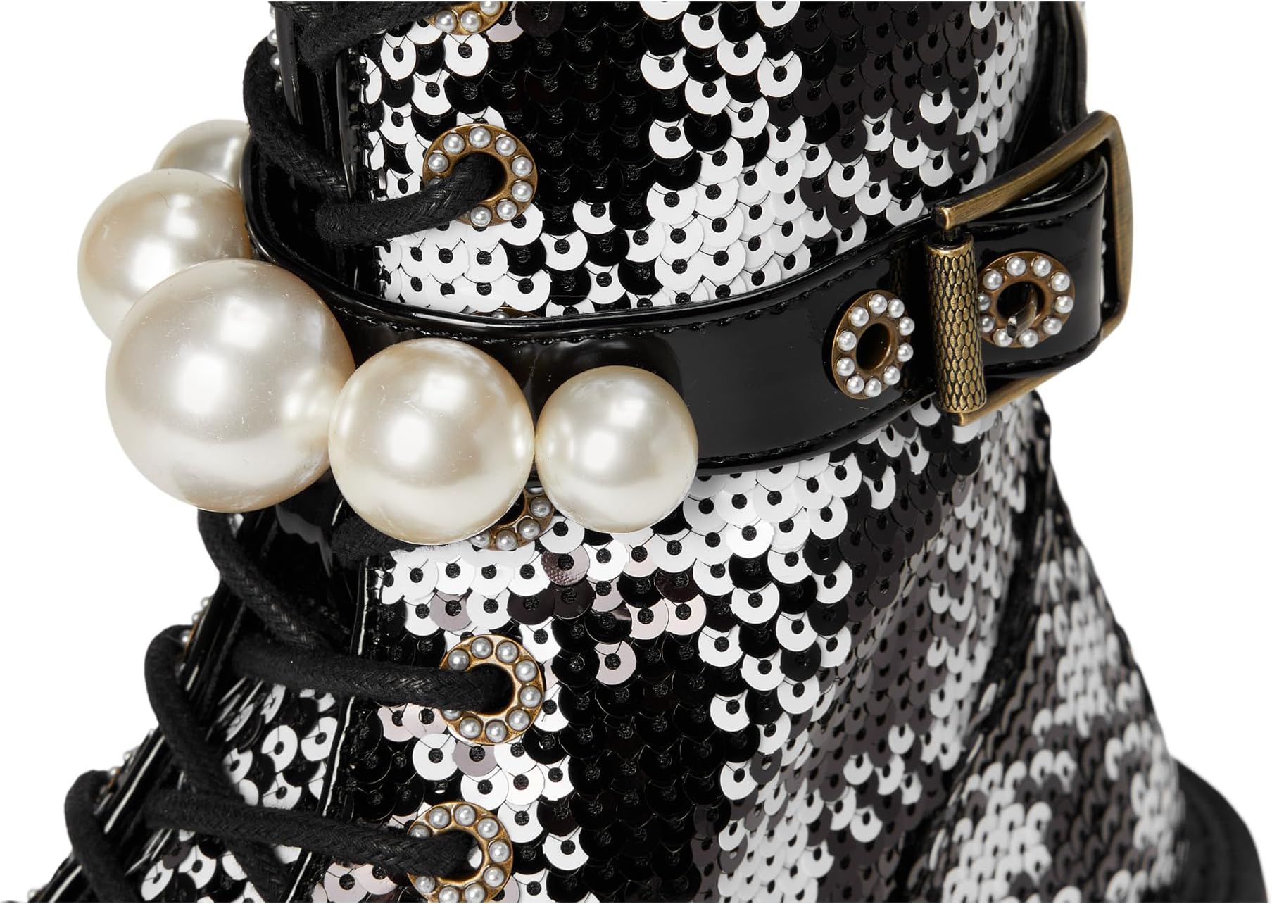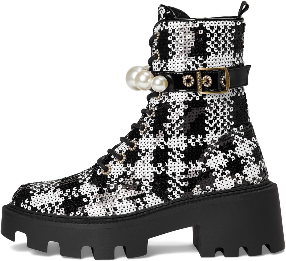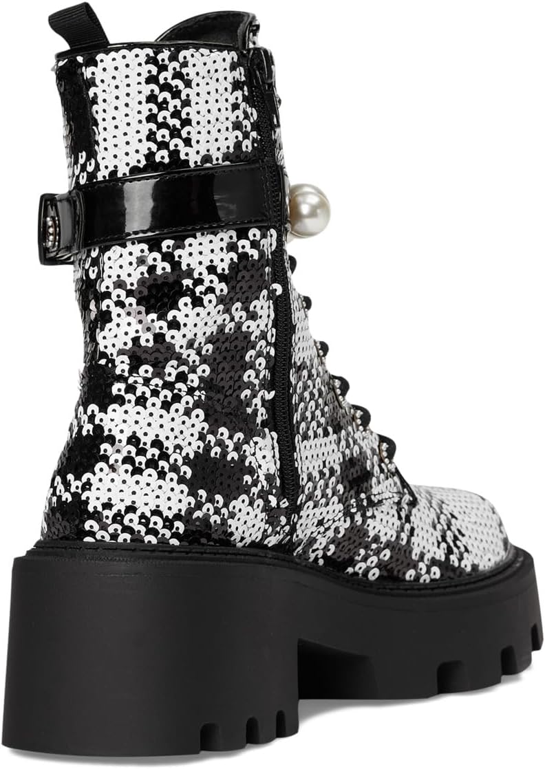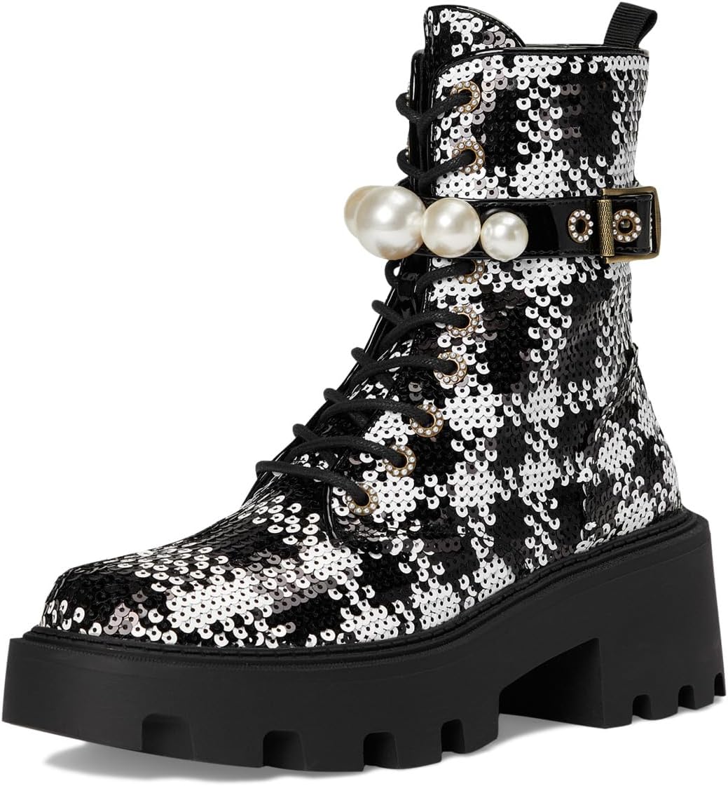 • Ботинки Blue от Betsey Johnson Jonnie Combat Boots, одобренные стильными девушками, с рифленой подошвой, женственной отделкой из жемчуга и пряжками по бокам. Высокие ботинки до щиколотки выполнены из полиэстеровой ткани с пайетками, подкладкой из полиэстера и полиуретановой стелькой. Прочный блочный каблук увеличивает высоту, а шнуровка с застежкой обеспечивает лёгкое надевание и снятие.