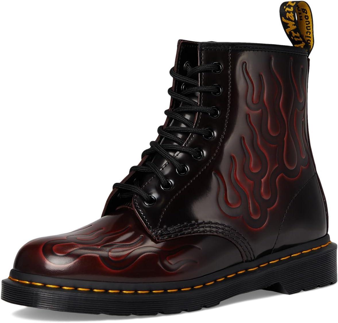 Классические ботинки Dr. Martens 1460 из Arcadia, блестящей архивной кожи, которая со временем проявляет базовый вишнево-красный оттенок. Верх украшен тисненым рисунком пламени.
