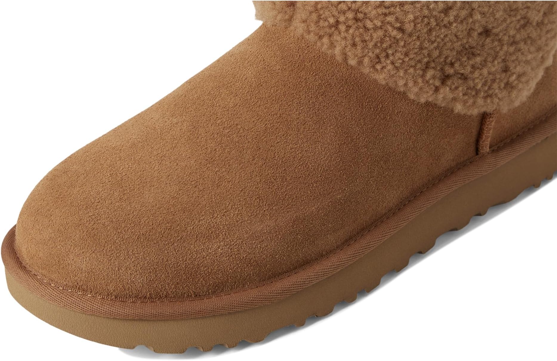 UGGbraid изготовлен из 100% переработанных полиэфирных волокон, замшевая задняя часть, замшевая союзка, мягкий воротник, 10-миллиметровое кудрявое голенище из овчины.