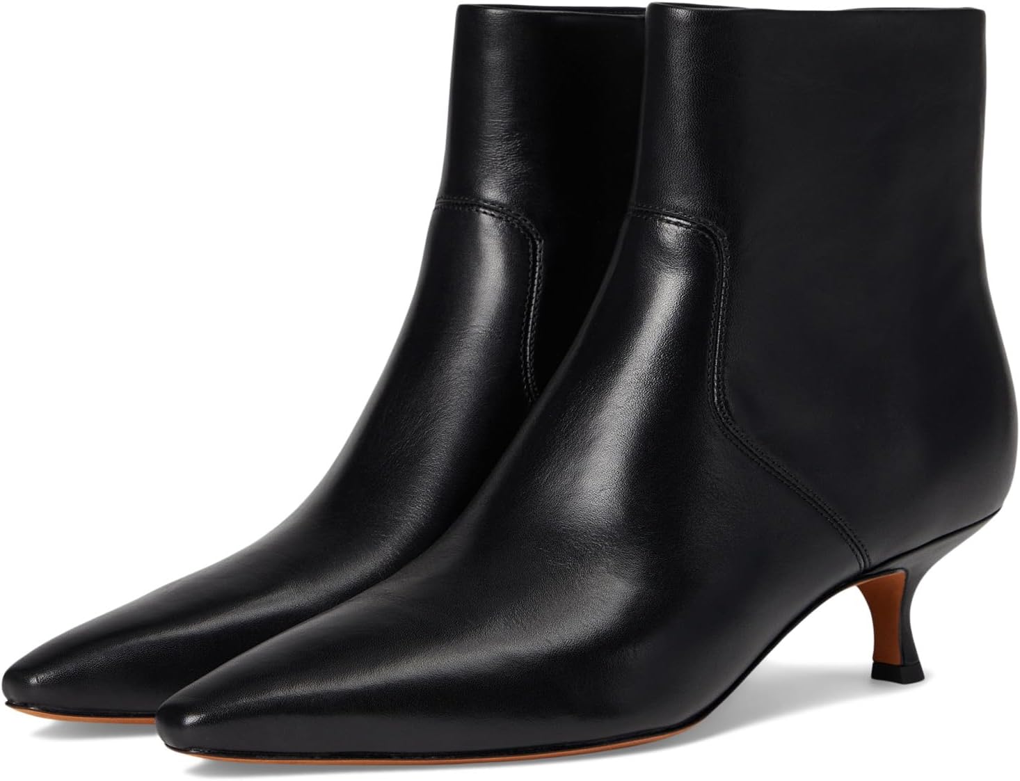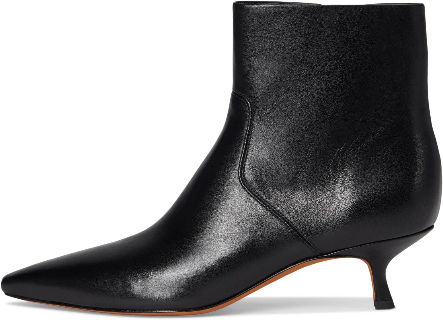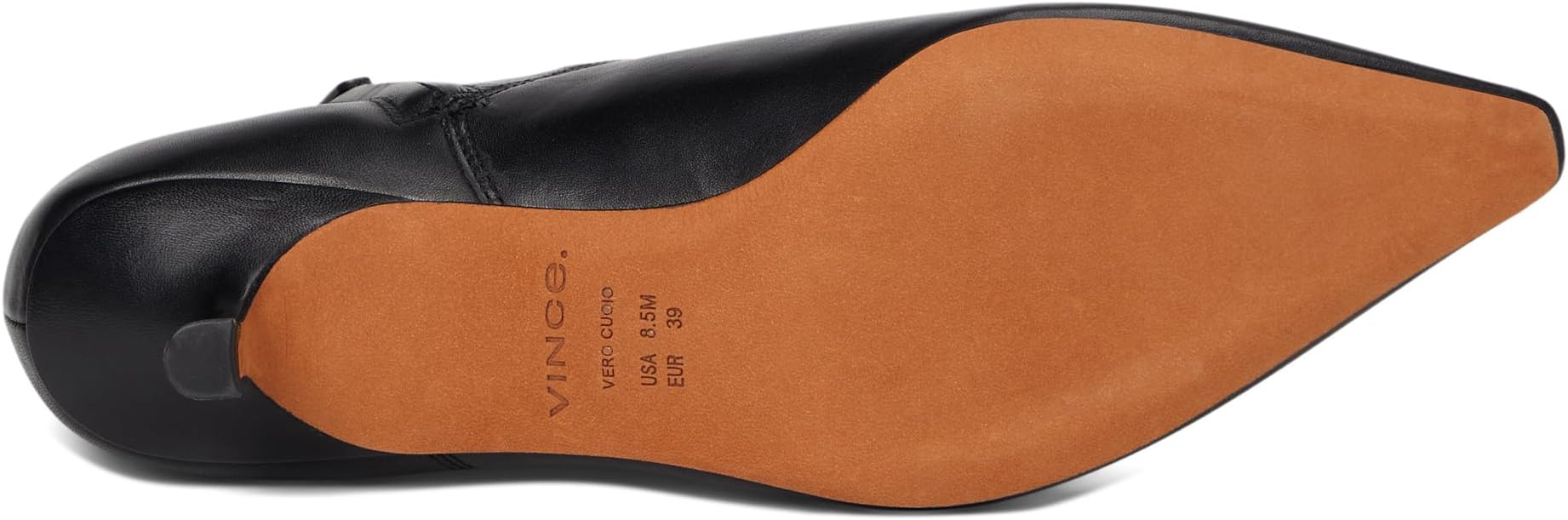 • Скромные и универсальные короткие ботинки Vince Simone Zip имеют заостренный носок и архитектурный каблук-рюмочку. Ботильоны по щиколотку изготовлены из кожи, верх и подкладка которой закупаются у кожевенных заводов, сертифицированных Leather Working Group.