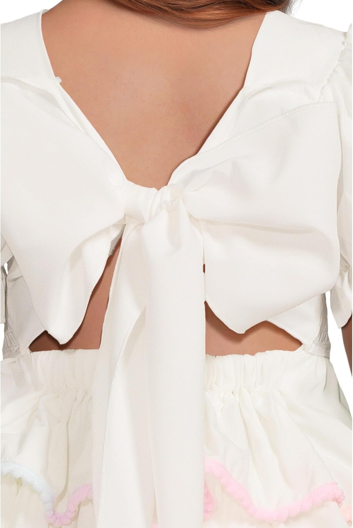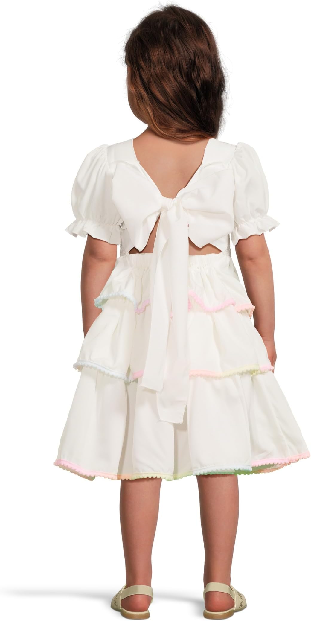 • Пусть она сияет ярко в белом радужном многоярусном платье Lola and The Boys. Это платье длиной до середины бедра с классическим круглым вырезом и милыми рукавами-крылышками украшено мягкими многоярусными оборками, отделанными в пастельных тонах, создавая всплеск радужного очарования. Благодаря свободному крою, платье легко надевать, а пышные рукава и очаровательный бант добавят немного девичьего шарма.