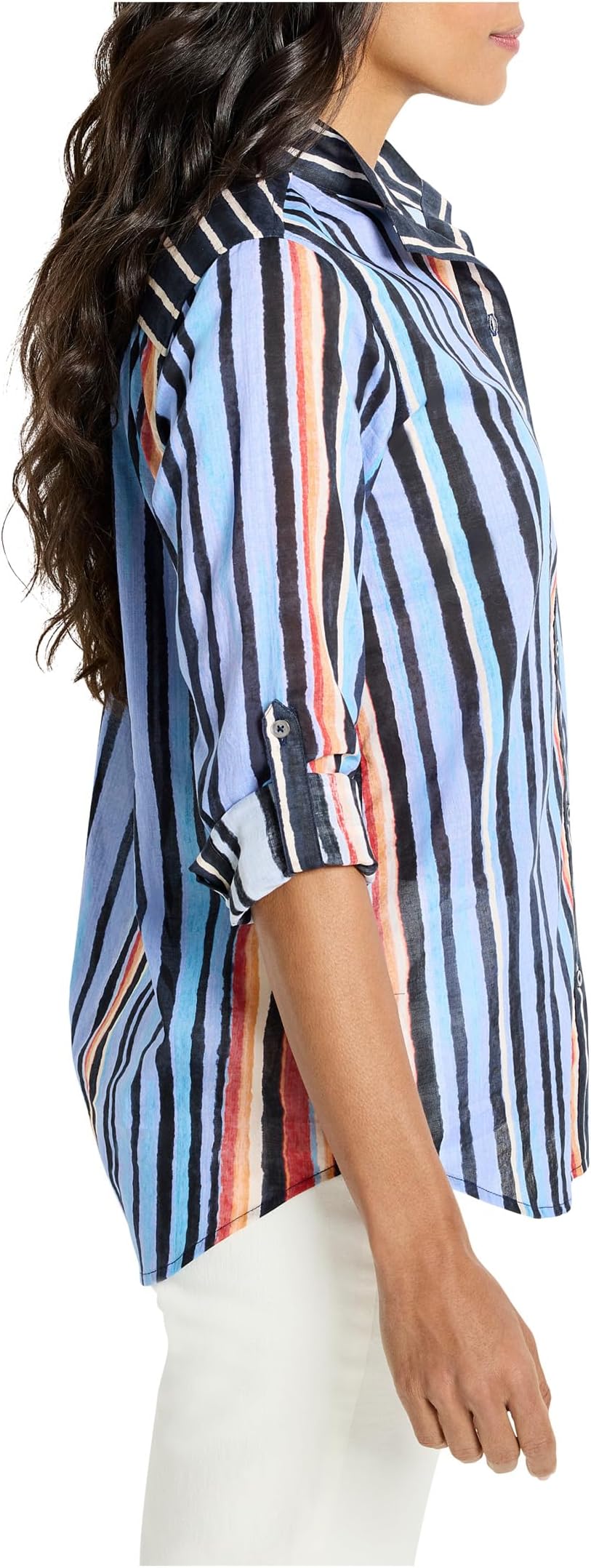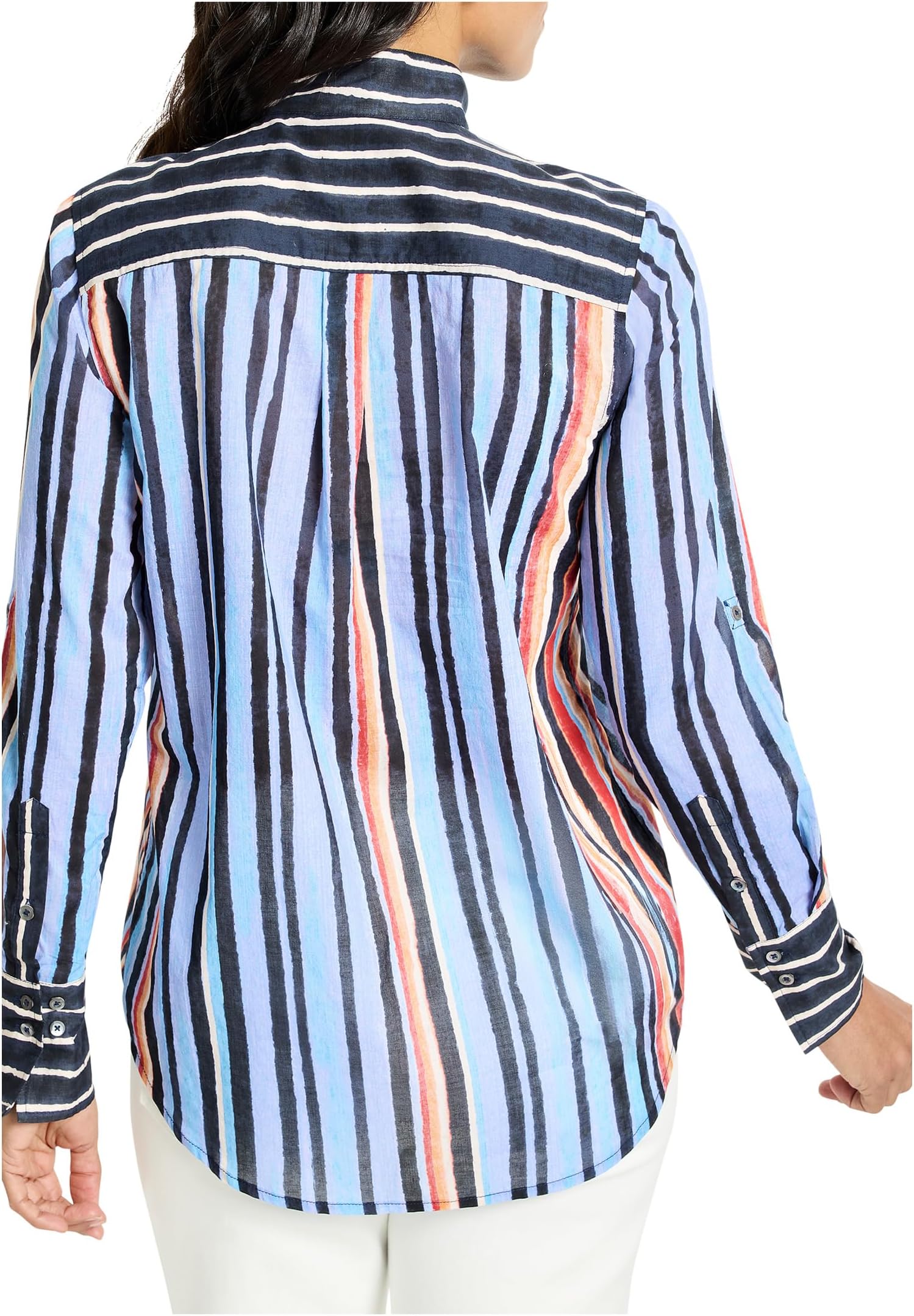 • Создайте стильный повседневный или деловой образ с помощью рубашки NIC+ZOE Painted Peninsula Cotton Shirt. Рубашка с принтом, каждая полоска которого расположена точно по месту, включая перевернутую горизонтальную полоску на внутренней стороне манжеты. Воротник-стойка, длинные рукава с манжетами на пуговицах, застежка на пуговицы спереди и свободный подол чуть ниже бедра.