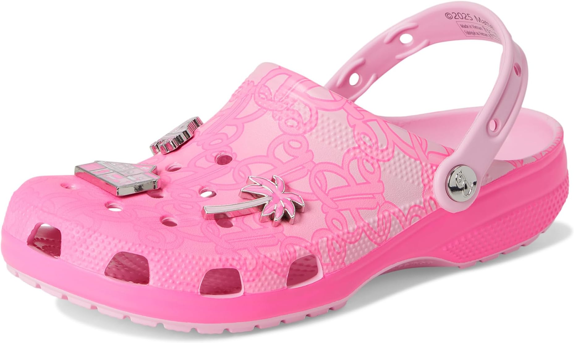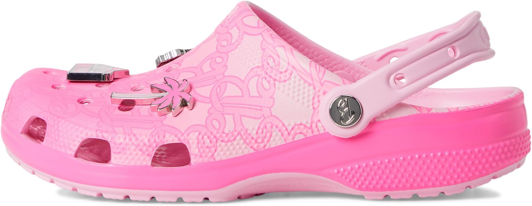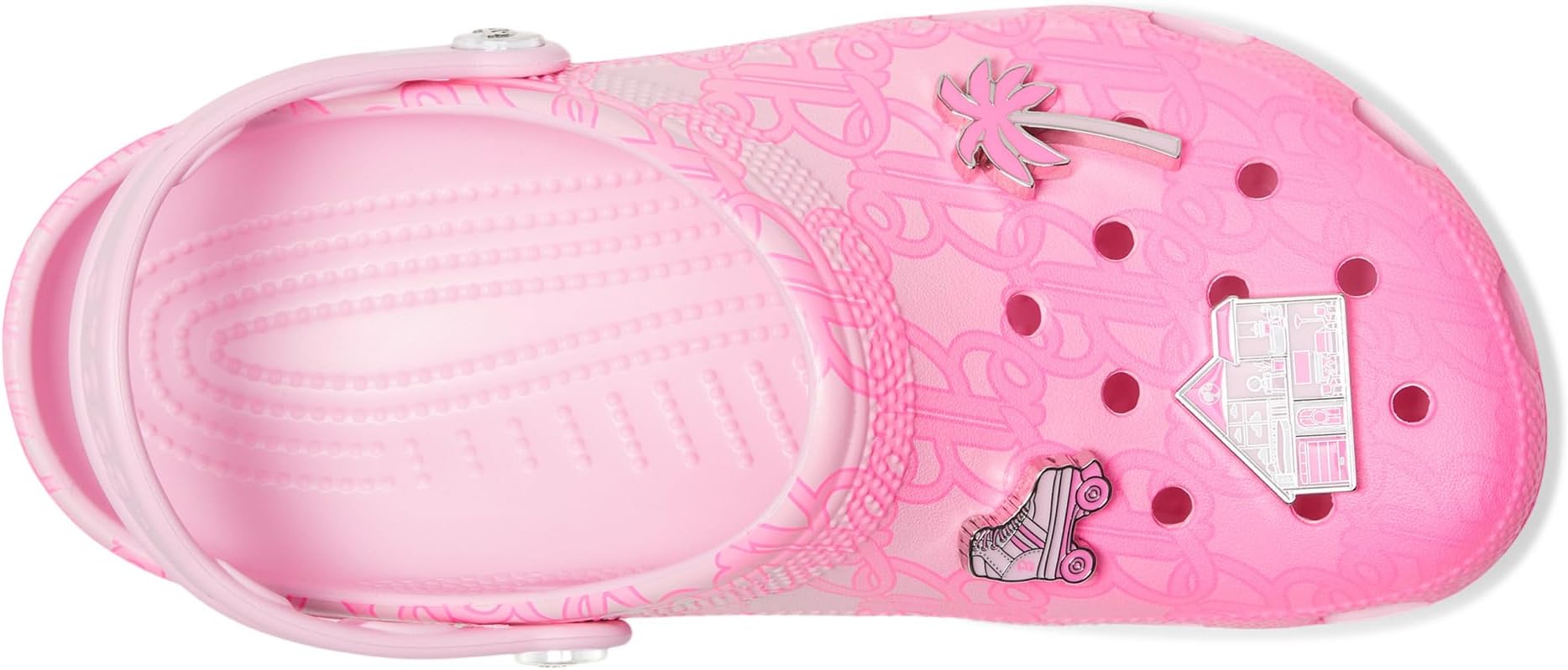• Новые Barbie Classic Clog — идеальный выбор для икон моды по всему миру. Эта удобная и стильная модель представлена в розовом оттенке со стильным монограммным принтом. Добавьте блеска вашему образу с помощью рельефных эмалевых подвесок Jibbitz с изображением домика мечты, роликового конька, пальмы, солнцезащитных очков в форме сердца и логотипа Barbie.
