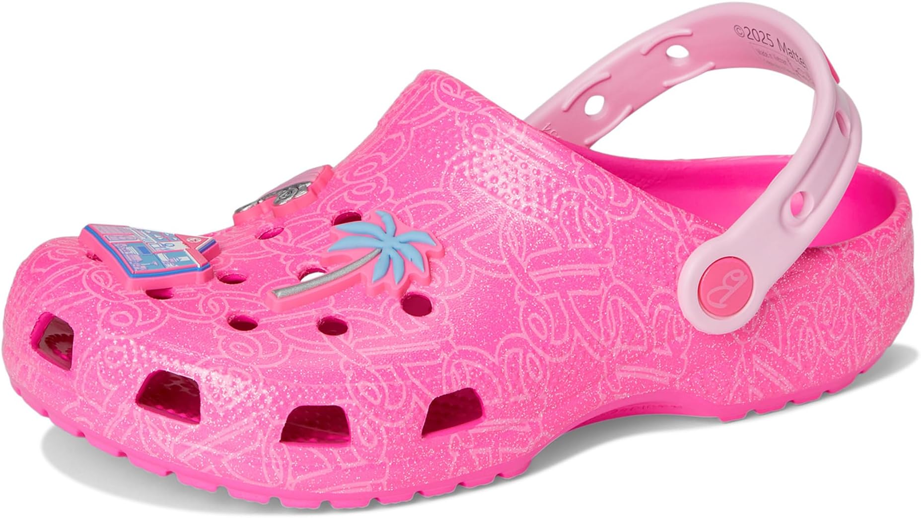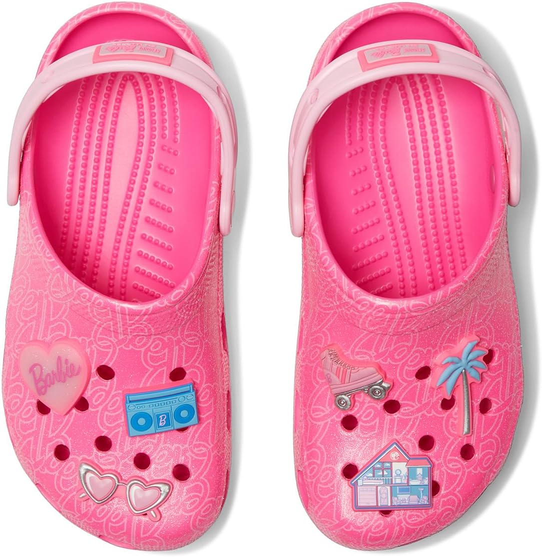 • Новые Barbie Classic Clog — идеальный выбор для икон моды по всему миру. Эта удобная и стильная модель представлена в ярко-розовом оттенке со стильным монограммным принтом. Сияйте с помощью эксклюзивных подвесок Jibbitz с изображением домика мечты, роликового конька, пальмы, солнцезащитных очков в форме сердца и логотипа Barbie.