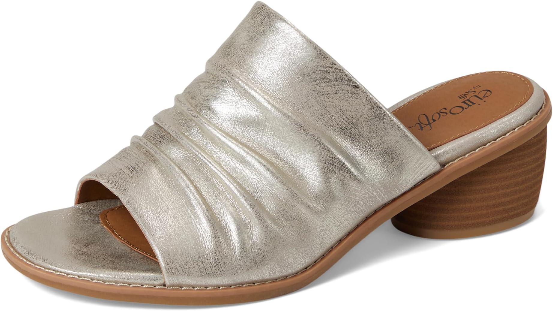 • Сандалии EuroSoft Corley, созданные с упором на поддержку и амортизацию, имеют верх из искусственной кожи с рюшами и круглый каблук, что придает им модный вид. Эта модель без застежек имеет квадратный открытый носок и гибкую резиновую подошву.