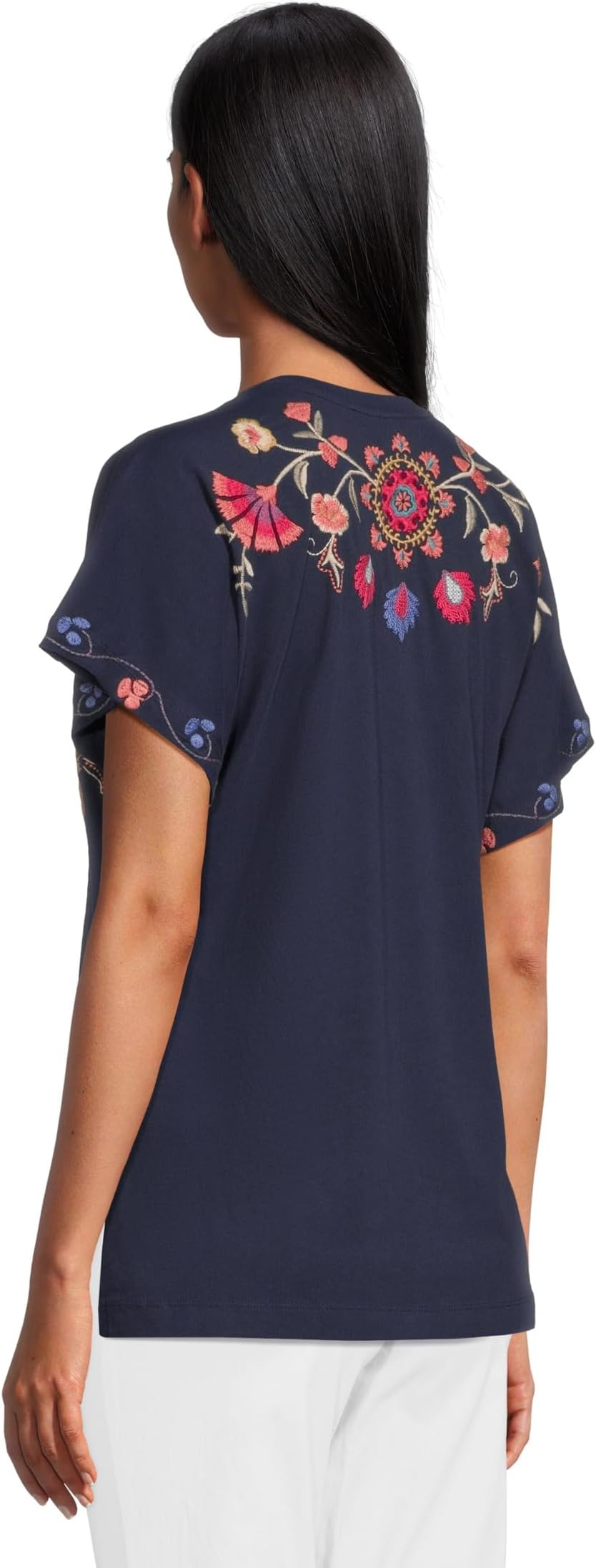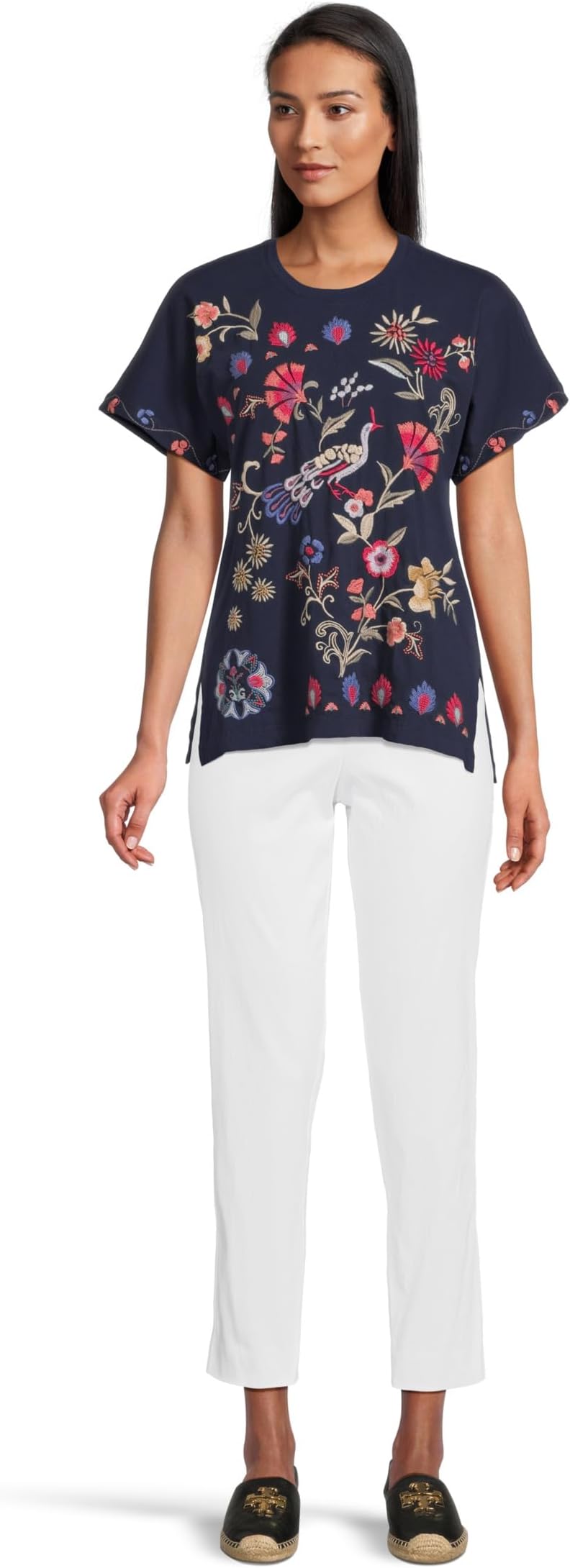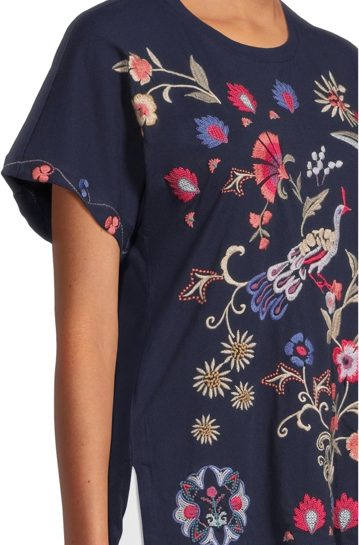 • Создайте непринужденный образ и почувствуйте непревзойденный комфорт в футболке Johnny Was Side Slit Dolman Tee от Gloria. Это свободный топ с короткими рукавами, глубоким темно-синим цветом, круглым вырезом и прямым силуэтом. Яркая деталь — красиво вышитый павлин, окруженный яркими цветами и листьями красного, розового, кремового и сиреневого оттенков. Вышивка добавляет текстуру и визуальный интерес, создавая яркий образ, вдохновленный природой.