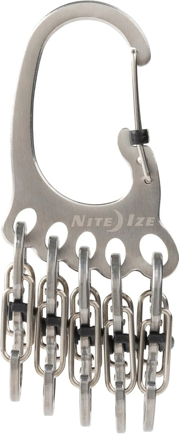 Формованные "пальцы" держат 5 нержавеющих карабинов S-Biner MicroLocks размера #0, которые могут удерживать до 3 ключей каждый и надежно запираться простым поворотным движением