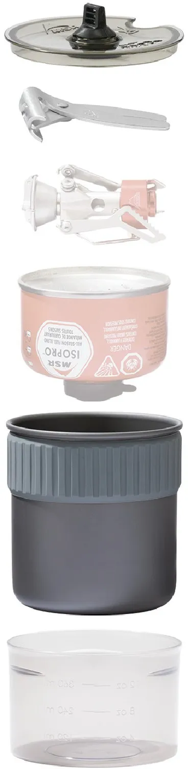 В набор входит кастрюля объемом 0,75 л из анодированного алюминия, чаша объемом 16 унций, прозрачная крышка с отверстиями для слива, мини-держатель для кастрюль и сумка для хранения. Кастрюля объемом 0,75 л кипятит достаточно воды для пакетной еды. Есть место, чтобы уложить внутрь плитку MSR PocketRocket 2 и ваш собственный топливный баллон объемом 4 унции (плита и топливный баллон не включены).