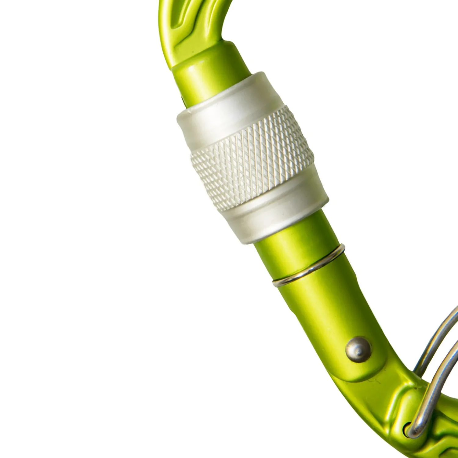 С инновационной стальной вставкой на вершине и внутренней пружиной для предотвращения закручивания, надежный карабин Edelrid HMS Bulletproof Screw FG идеально подходит для использования с устройствами для страхования.