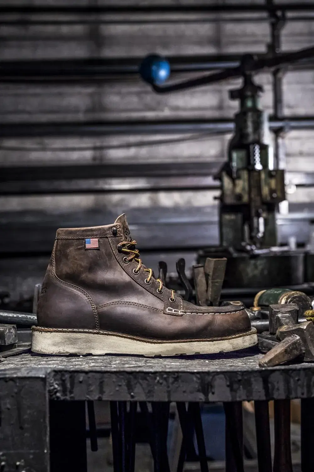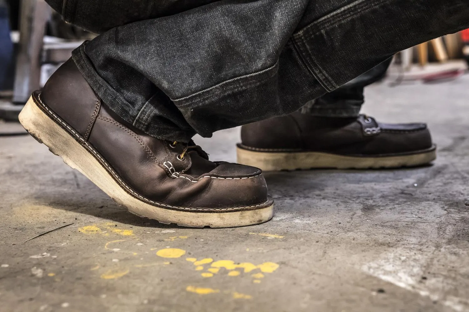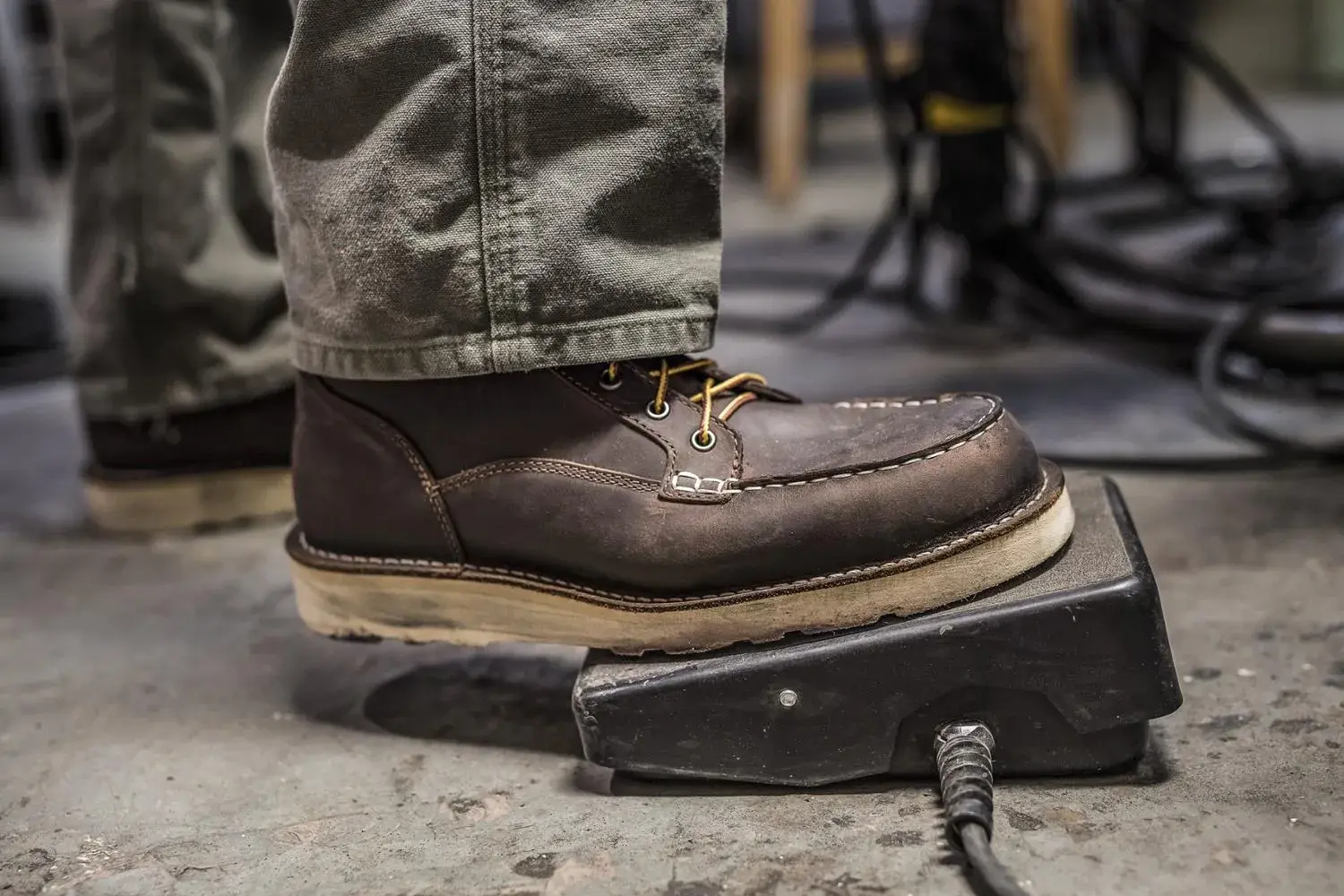 Прочные, пропитанные маслом, верха из натуральной кожи имеют дизайн с мокасиновым носком и ручную прокладку, обеспечивающую прочность и стабильность. Открытые ячейки стелек OrthoLite обеспечивают комфортную амортизацию. Стальные вставки добавляют поддержку. Не оставляющие следов, устойчивые к маслу и скольжению подошвы в виде клина обеспечивают надежное сцепление. Изготовлено в США с импортными компонентами.