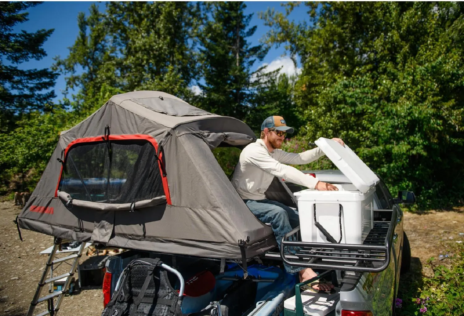 600-денний рипстоп поліестер і водонепроникне покриття з ПУ (поліуретан) з водонепроникністю 3000 мм забезпечує захист у будь-яку погоду ​​˧ Водонепроникний дощовик з рипстоп поліестеру 210-ден також має водонепроникне покриття з ПУ 3000 мм для повного захисту від погодних явищ ​​˧ Геометрія каркасу пропонує більше корисного простору ​​˧ Великі вікна, двері та сітчаста панель забезпечують чудові вигляди та хорошу вентиляцію ​​˧ Включений матрац з пінопласту товщиною 2,5 дюйма від стіни до стіни забезпечує комфорт протягом всієї ночі; матрац з пінопласту має знімний чохол для зручного очищення ​​˧ Вертушки та D-кільця на підлозі намету для підвішування спорядження або прив'язування намету у вітряну погоду ​​˧ Антиударна підлога намету з текстурованою поверхнею додає міцності ​​˧ Алюмінієвий каркас намету легкий, міцний і заздалегідь налаштований для легкого монтажу ​​˧ Лестниця має точки середньої висоти для простого налаштування; автоматична функція закриття лесвиці спрощує закриття ​​˧ Монтажні кріплення для автомобіля без інструментів і з можливістю блокування — легко одягати, швидко знімати.