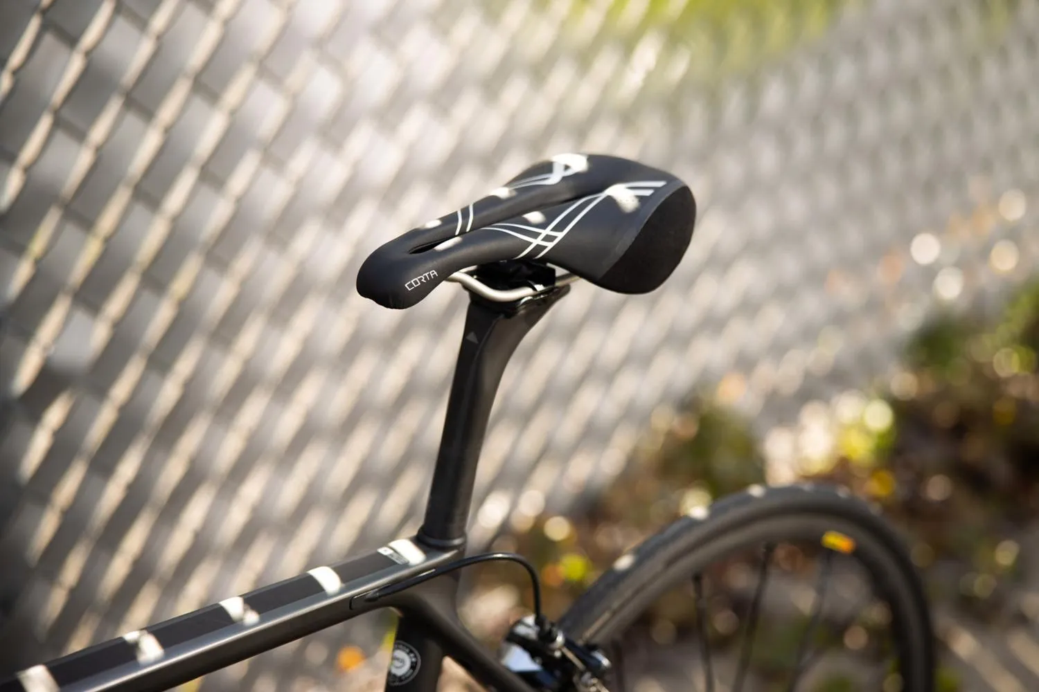 Краткая общая длина, обрубленный нос и большая выемка объединяются, чтобы устранить избыточную площадь поверхности, предотвратить натирание и снизить давление. Большая выемка обеспечивает наибольший возможный канал облегчения. Плоская, поддерживающая задняя часть предоставляет хорошую платформу для продолжительных восходящих подъемов в сидячем положении. Обложка Dura-tek и панели микросуэда бесшовно соединены, обеспечивая гладкую контактную поверхность для снижения натирания. Графика, напечатанная на экране, и перфорации добавляют детали. Титановые (ti-316) рельсы помогают снизить вес. Сделано в Италии.
