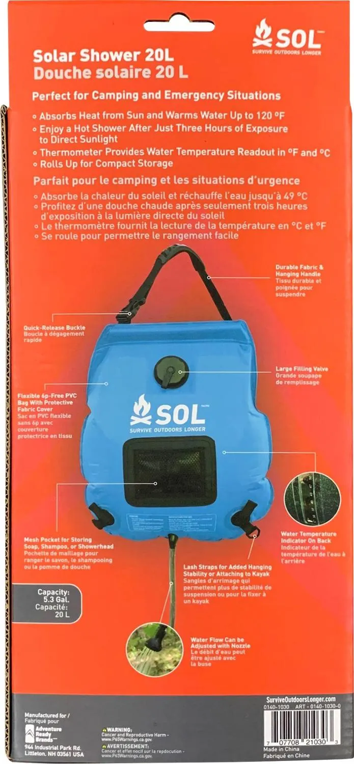 Промойтесь после вашего приключения с портативным солнечным душем SOL, который может нагреть 20 литров воды до 49°C, поглощая солнечное тепло. Встроенный термометр позволяет вам проверять температуру.