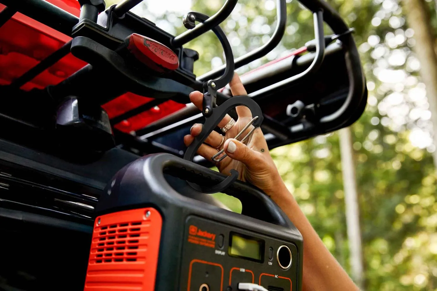 Прикрепите или подвесьте свой рюкзак, фонарь, систему гидратации или другое снаряжение на ветки деревьев, заборы, двери и другие предметы