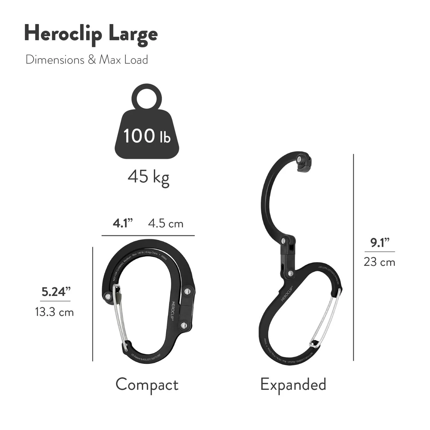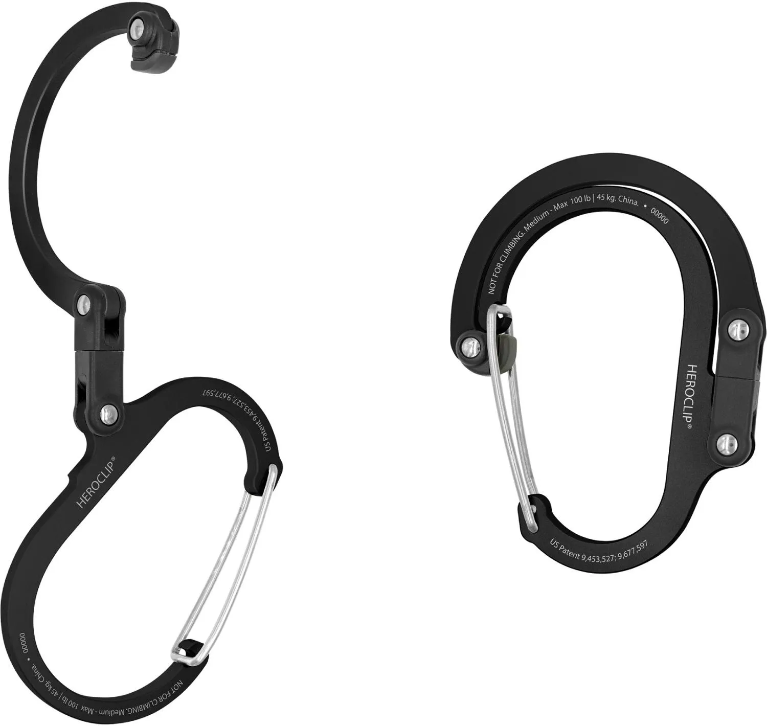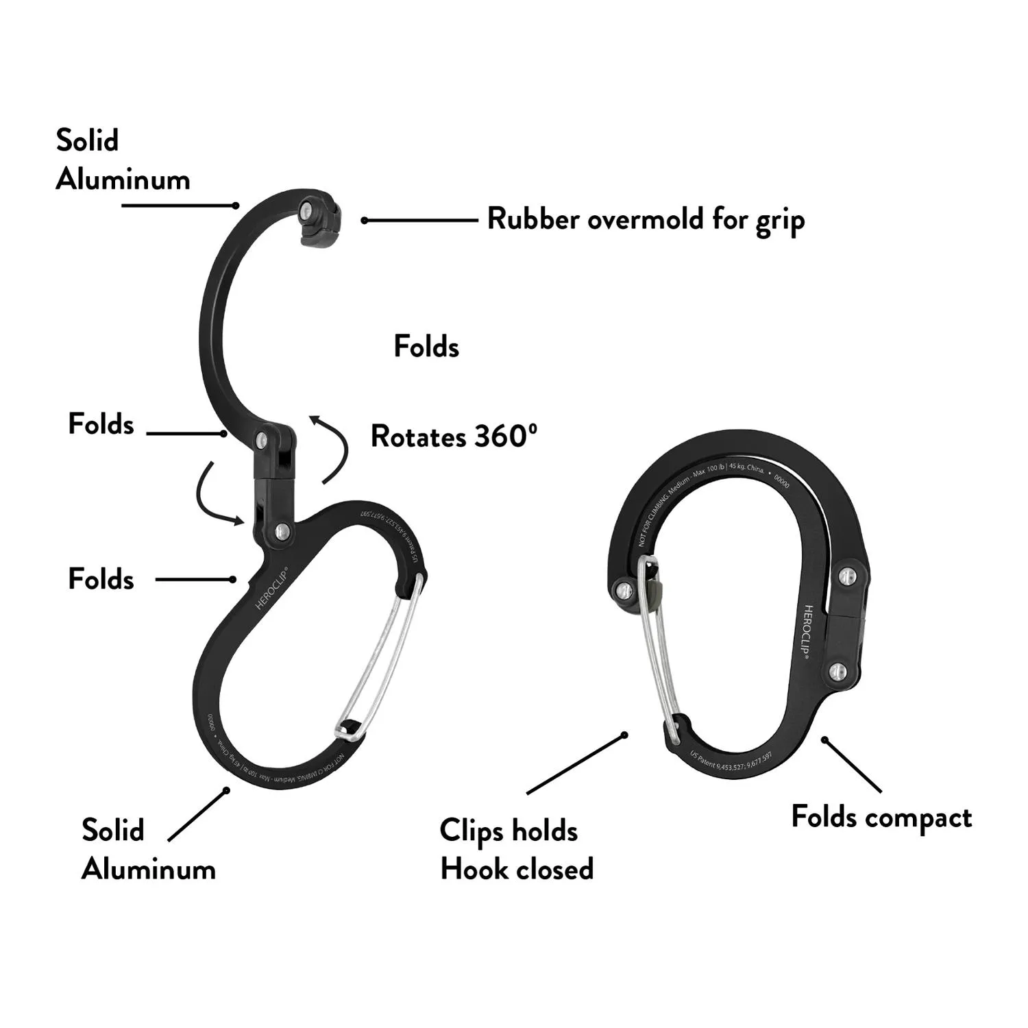 Полнофункциональный клип с поворачивающимся складным крючком, большой крючок HEROCLIP выдерживает до 100 фунтов, поворачивается на 360°, складывается в двух местах и имеет резиновый наконечник, чтобы то, что вы вешаете, оставалось на месте.