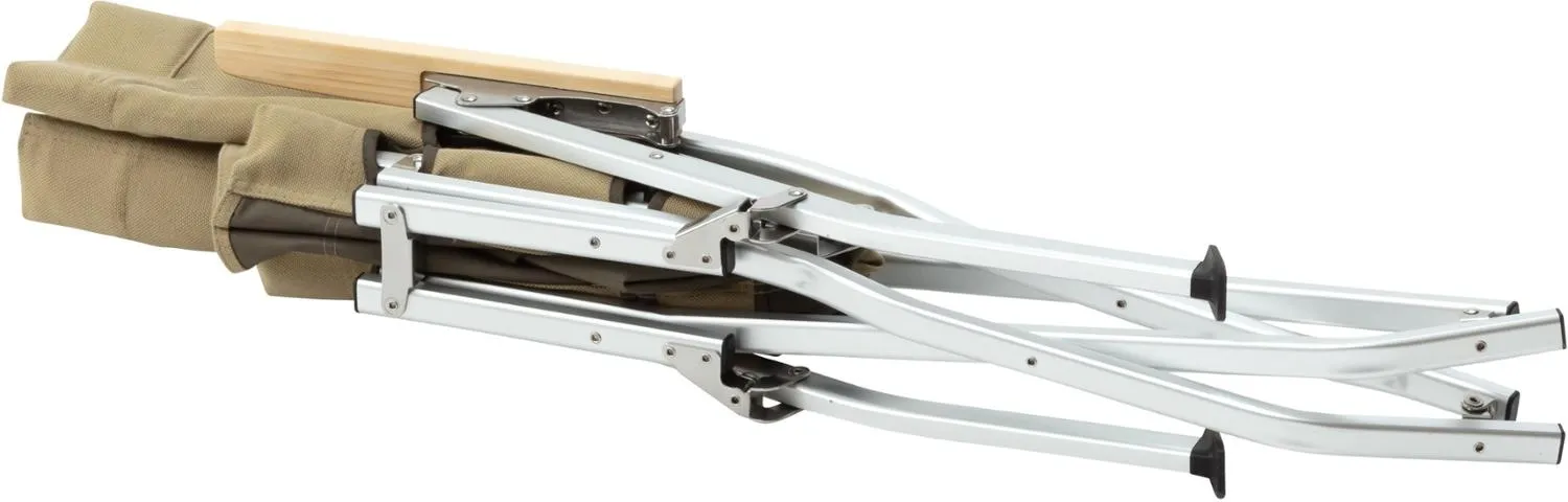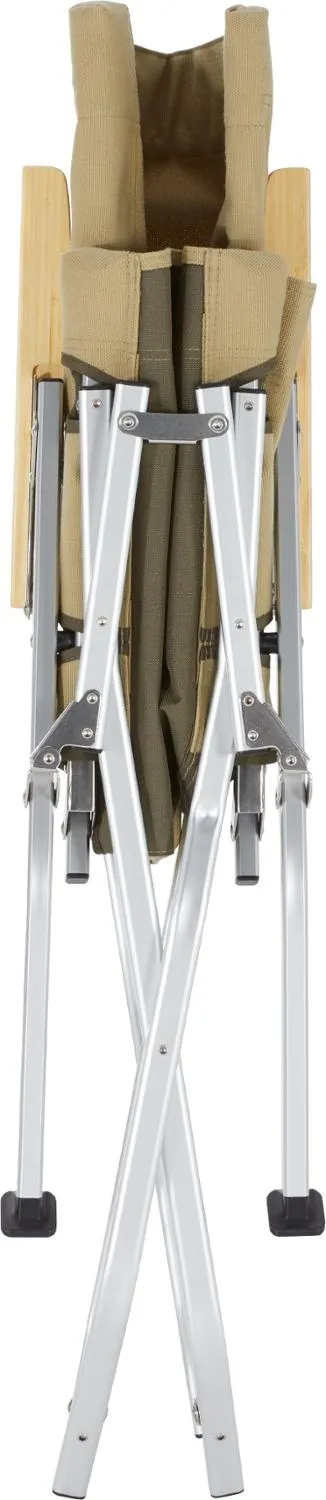 Крепкая холщевая ткань дополнена подлокотниками из бамбукового дерева и алюминиевой рамой. Кресло складывается и хранится в прилагаемом чехле для удобной транспортировки.