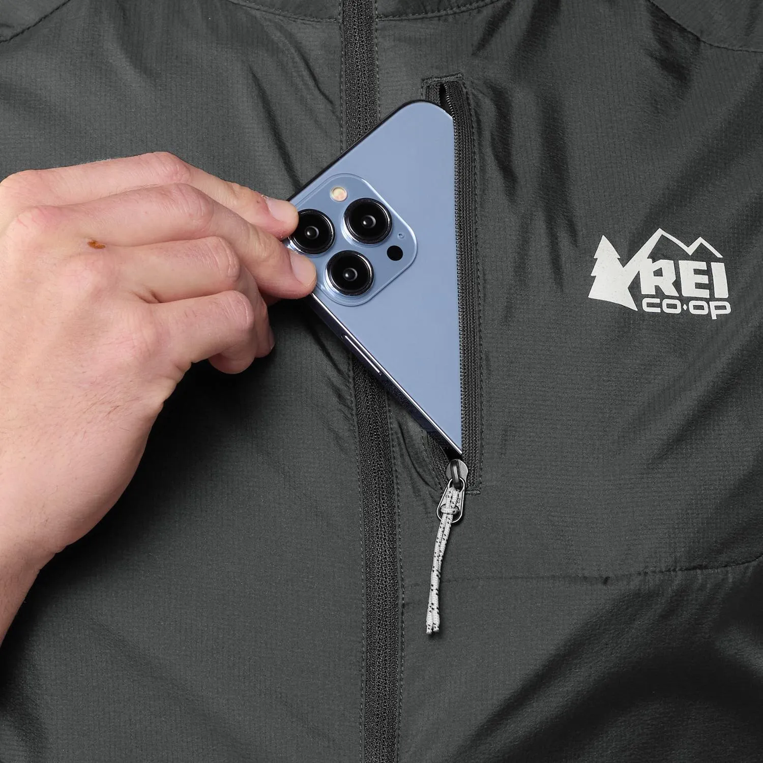 Застежка на молнии на груди (7,5 x 6,5 дюйма) вмещает ваш телефон и также может служить упаковочным мешком для жилета